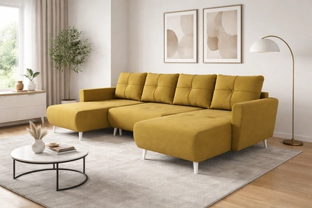 Narożnik z funkcją spania Felicie U musztardowy stylowy i elegancki narożnik wpisujący się w aranżacje w stylu skandynawskim