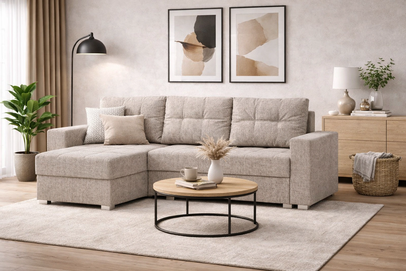 Narożnik z funkcją spania Pablos beżowy uniwersalny narożnik z pojemnikiem na pościel dekoracyjne pikowania na siedzisku