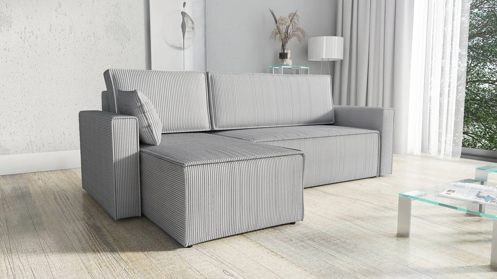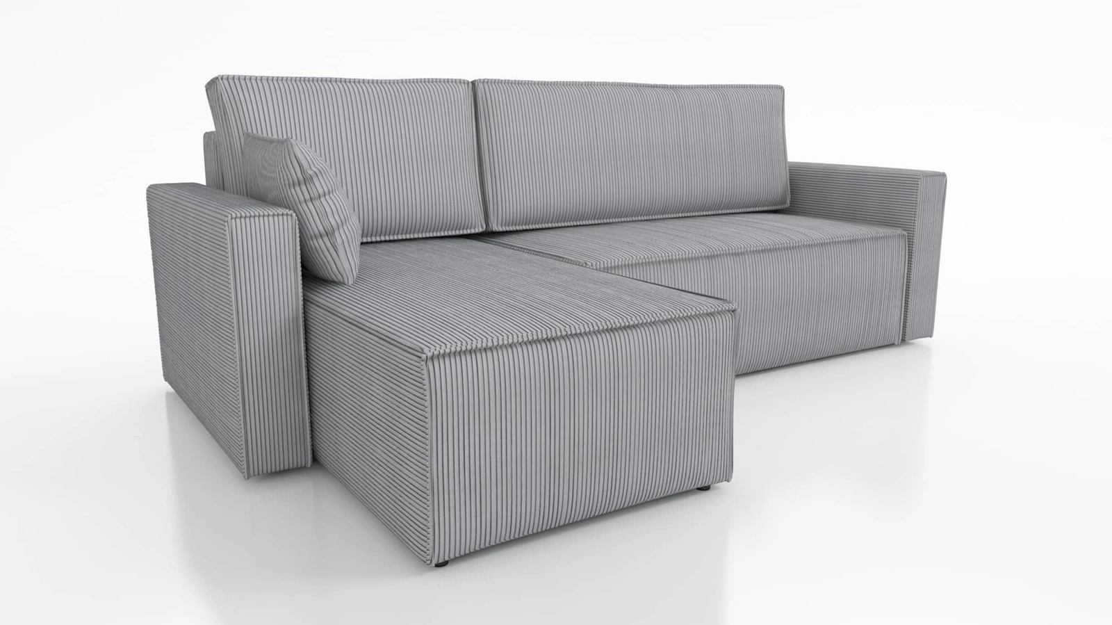 Trójwymiarowa sztruksowa tkanina o wyrazistych i grubych prążkach nadaje szczególnego charakteru oraz wyjątkowej urody. Tkanina jest bardzo miękka, a przy tym mocna i wytrzymała. Tkanina obiciowa Poso jest odporna na ścieranie, a także łatwa do utrzymania w czystości. Dzięki temu narożnik rozkładany Rebenes przez długi czas będzie wyglądał estetycznie i elegancko. Narożnik z funkcją spania codziennego wykonany został z wysokiej jakości materiałów, które charakteryzują się odpornością na wpływ czynników zewnętrznych takich jak obicia mebla oraz różnego typu uderzenia.
