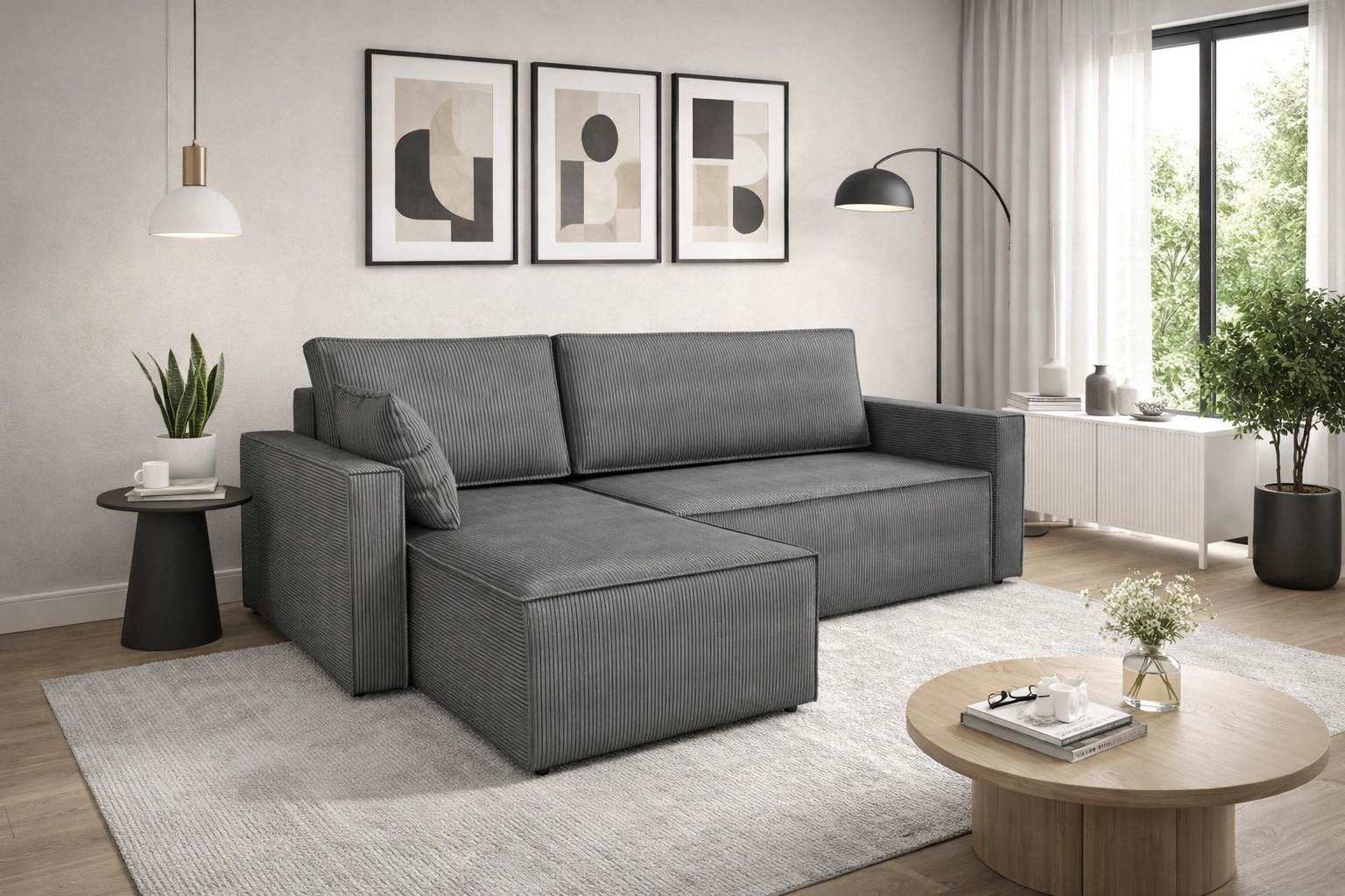 Narożnik z funkcją spania Rebenes szary uniwersalny narożnik trójwymiarowa tkanina o wyrazistych prążkach pojemnik na pościel
