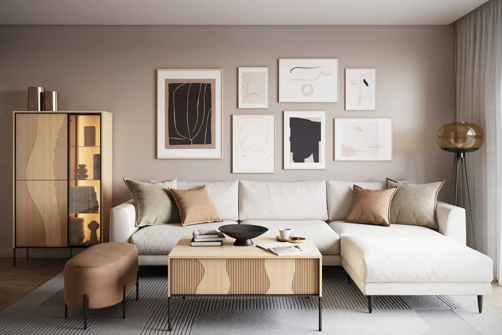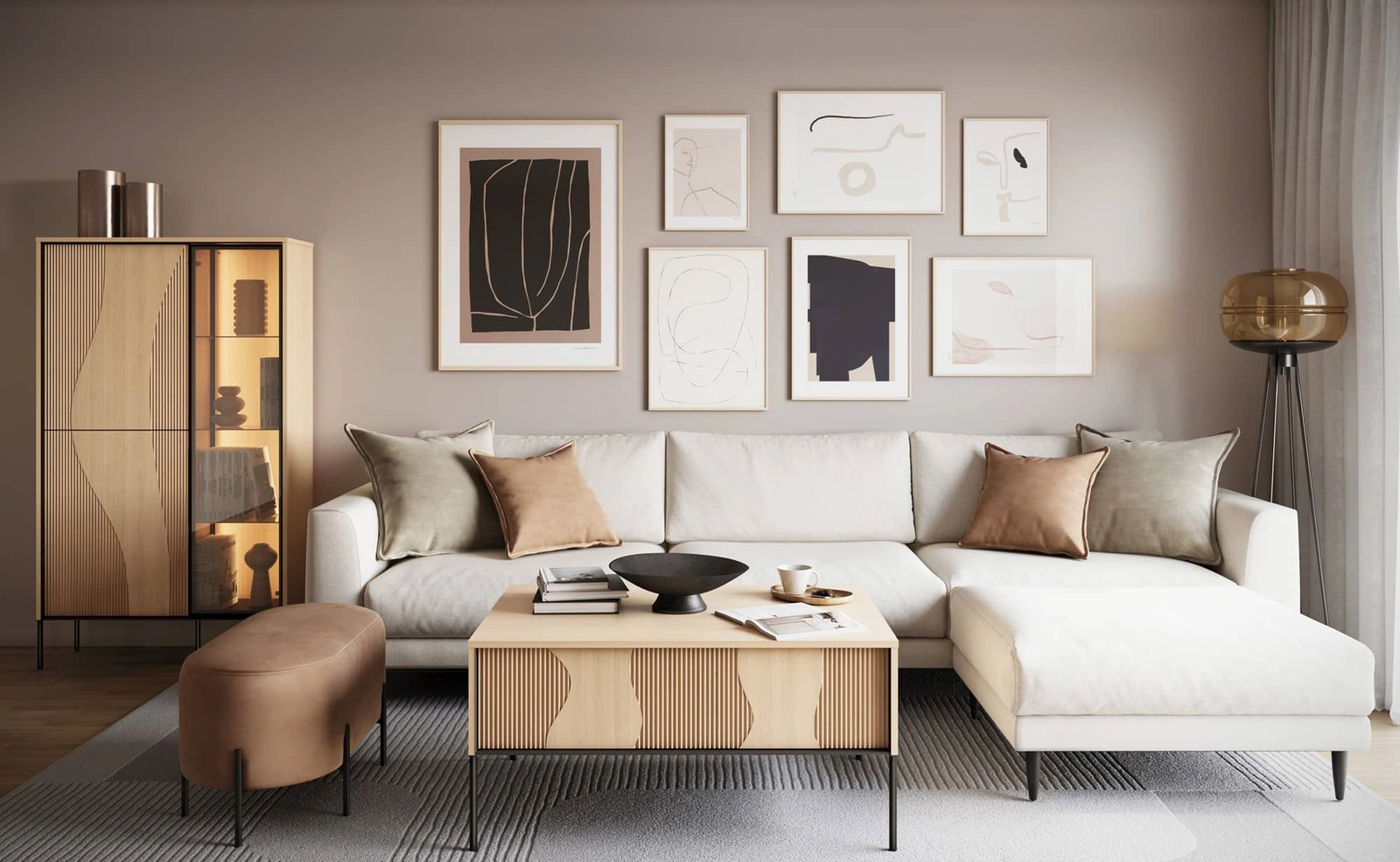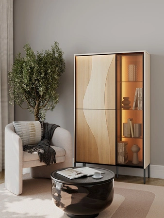Witryna do salonu z kolekcji Flow powstała z myślą o naturalnych i miękkich formach. Ciekawy charakter buduje designerski, falujący kształt na frontach, tworząc wrażenie ruchu zapisanego w płycie. Subtelne oświetlenie LED podkreśla linie ryfli i nieregularnych zdobień tworząc atmosferę nowoczesnego, dopracowanego wnętrza. Witryna szklana została osadzona na solidnych, metalowych nogach które nie tylko nadają charakteru, ale także zwiększają stabilność i odporność na obciążenia. Wnętrze zaprojektowane jest tak, aby ułatwiało organizację. Każdy element witryny został dopracowany w najmniejszych detalach, by ocieplić i uszlachetnić przestrzeń.
