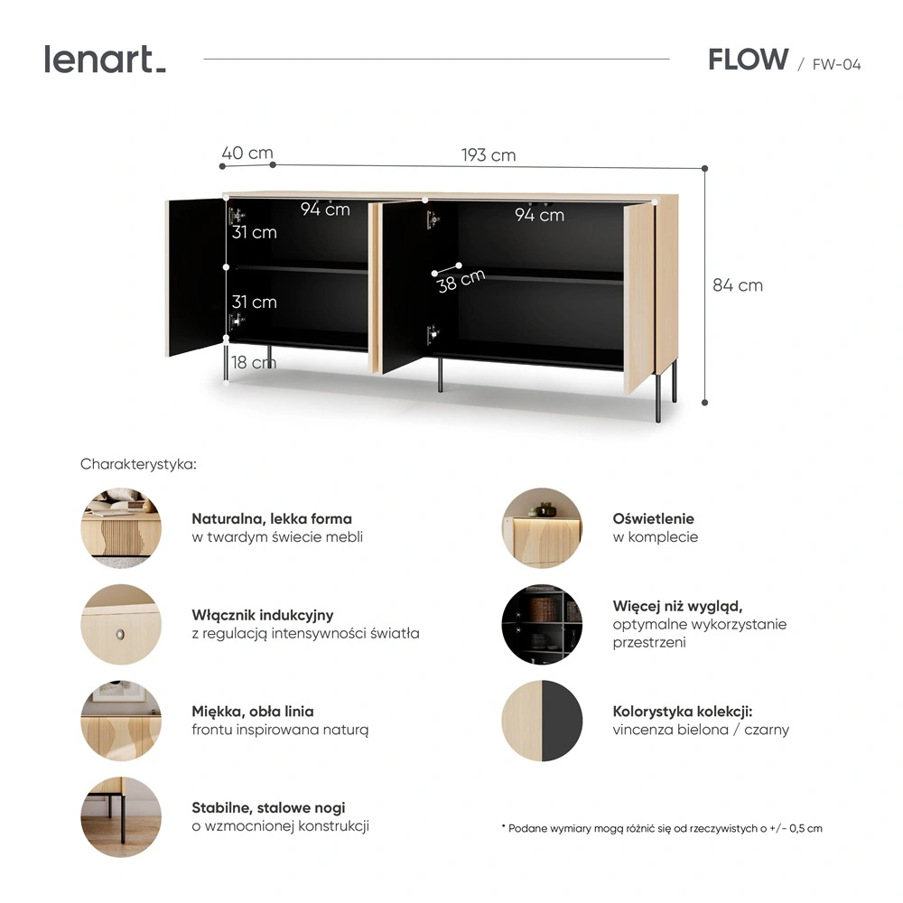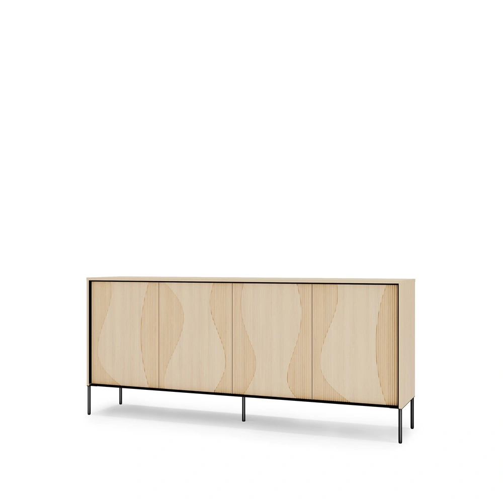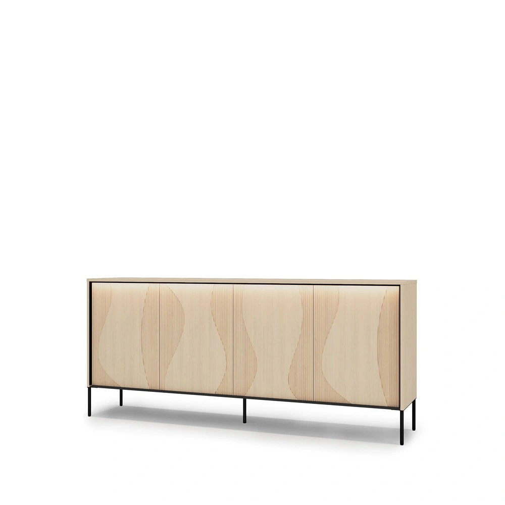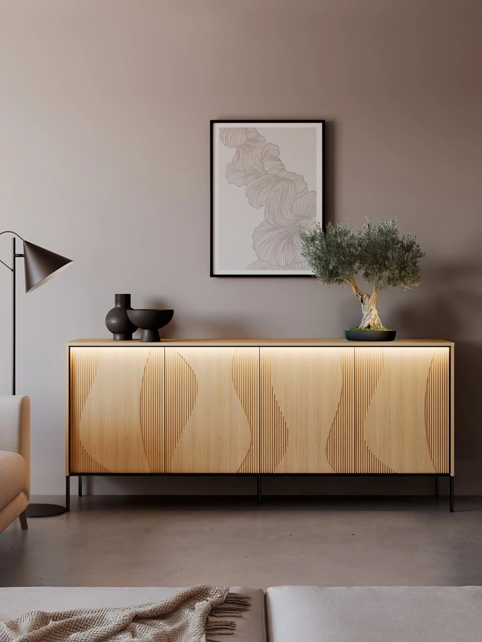 Komoda z kolekcji Flow powstała z myślą o naturalnych i miękkich formach. Ciekawy charakter buduje designerski, falujący kształt na frontach, tworząc wrażenie ruchu zapisanego w płycie. Subtelne oświetlenie LED podkreśla linie ryfli i nieregularnych zdobień tworząc atmosferę nowoczesnego, dopracowanego wnętrza. Komoda do salonu została osadzona na solidnych, metalowych nogach które nie tylko nadają charakteru, ale także zwiększają stabilność i odporność na obciążenia. Wnętrze zaprojektowane jest tak, aby ułatwiało organizację. Każdy element komody został dopracowany w najmniejszych detalach, by ocieplić i uszlachetnić przestrzeń.