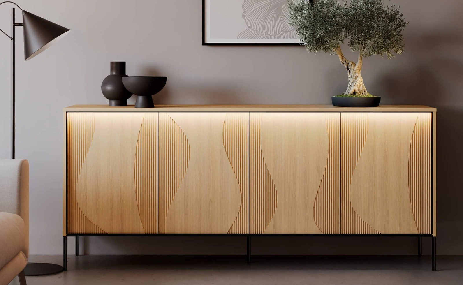 - Komoda Flow to subtelna i miękka bryła zainspirowana naturalnymi kształtami. Zewnętrzne oświetlenie LED dyskretnie podkreśla linie ryfli i nieregularnych zdobień frontów. Metalowe nogi nadają nowoczesnego charakteru, ale także zwiększają stabilność.