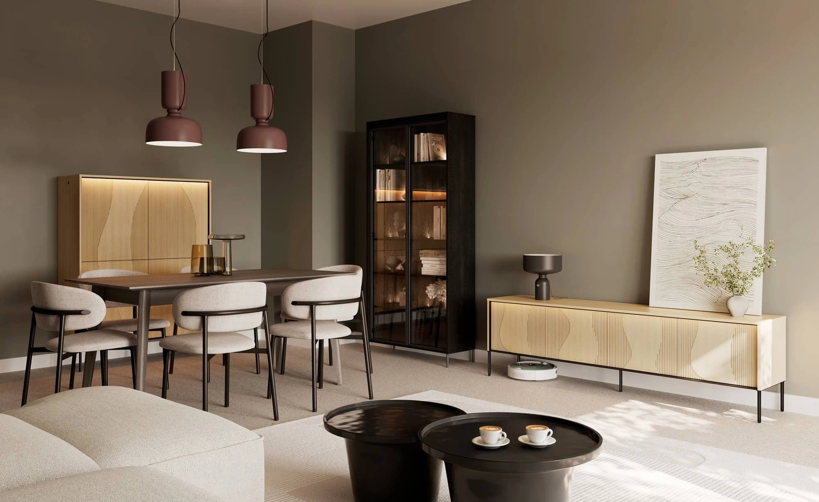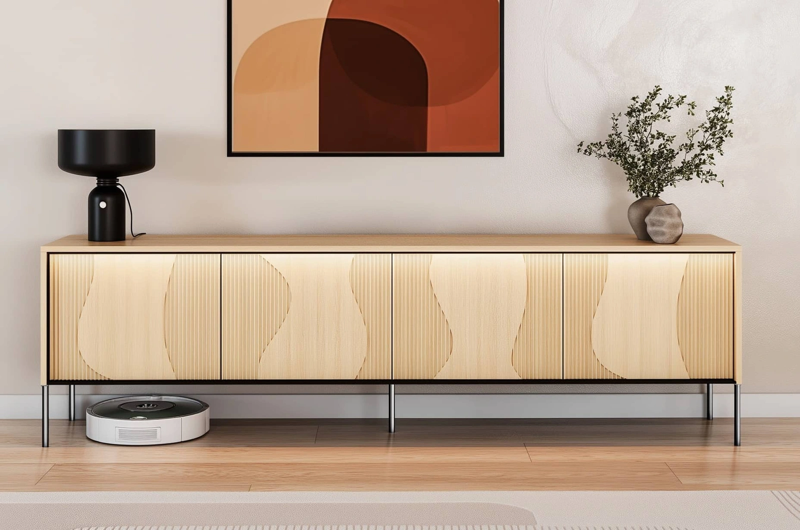 Szafka RTV Flow to design, który nawiązuje do harmonii organicznych krzywizn, ale pozostaje abstrakcyjny i elegancki.