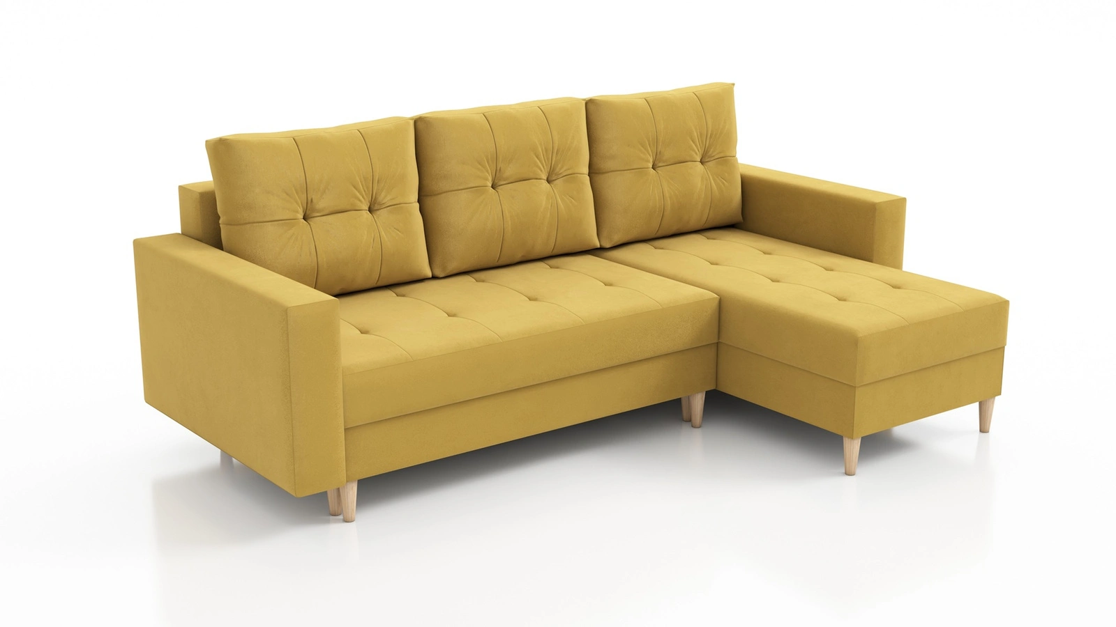 Narożnik z funkcją spania Vaso musztardowy uniwersalny wygodny narożnik do salonu w stylu skandynawskim duży pojemnik na pościel
