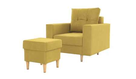 Fotel z podnóżkiem Vaso musztardowy wygodny fotel do salonu w stylu skandynawskim miękkie siedzisko wysokie drewniane nogi