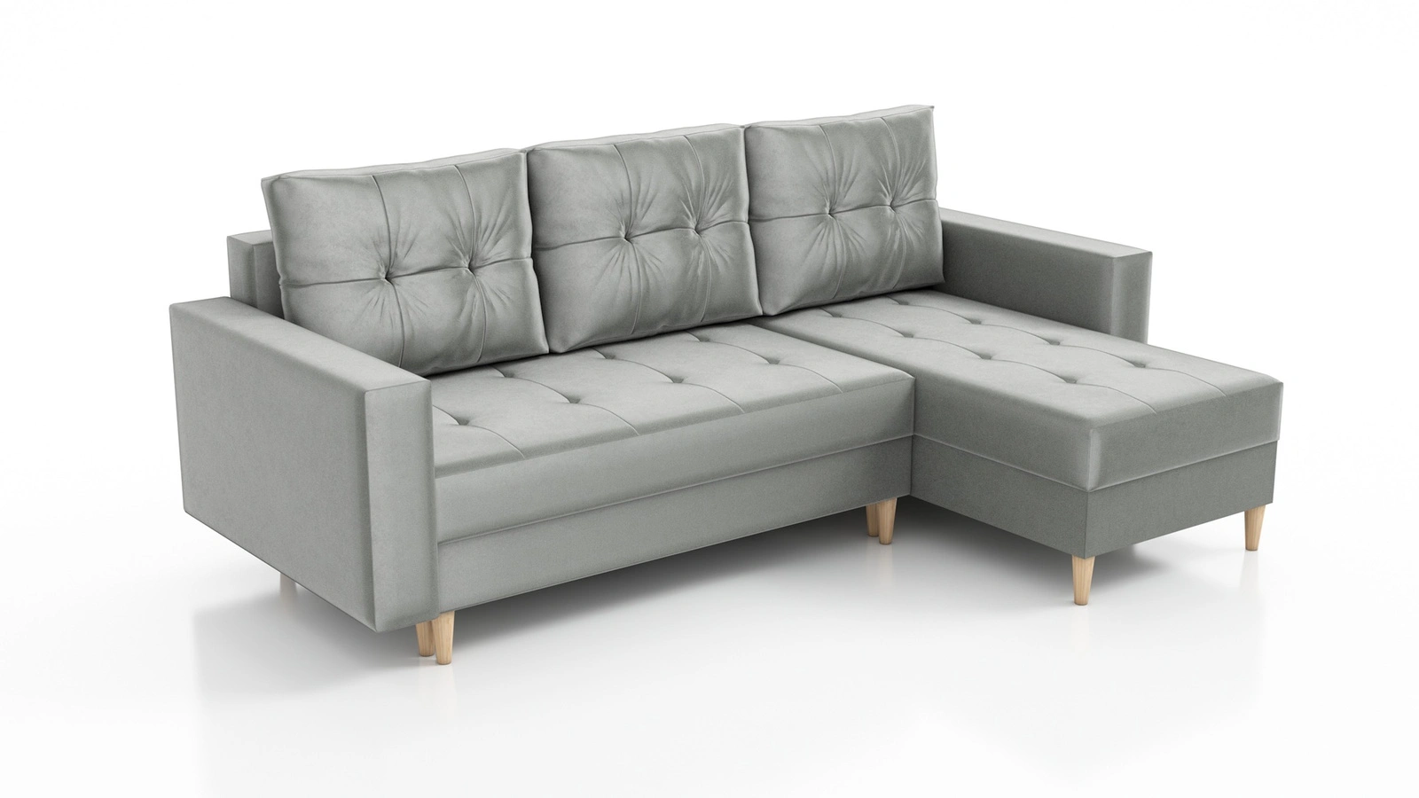 Narożnik z funkcją spania Vaso jasny szary uniwersalny wygodny narożnik do salonu w stylu skandynawskim duży pojemnik na pościel