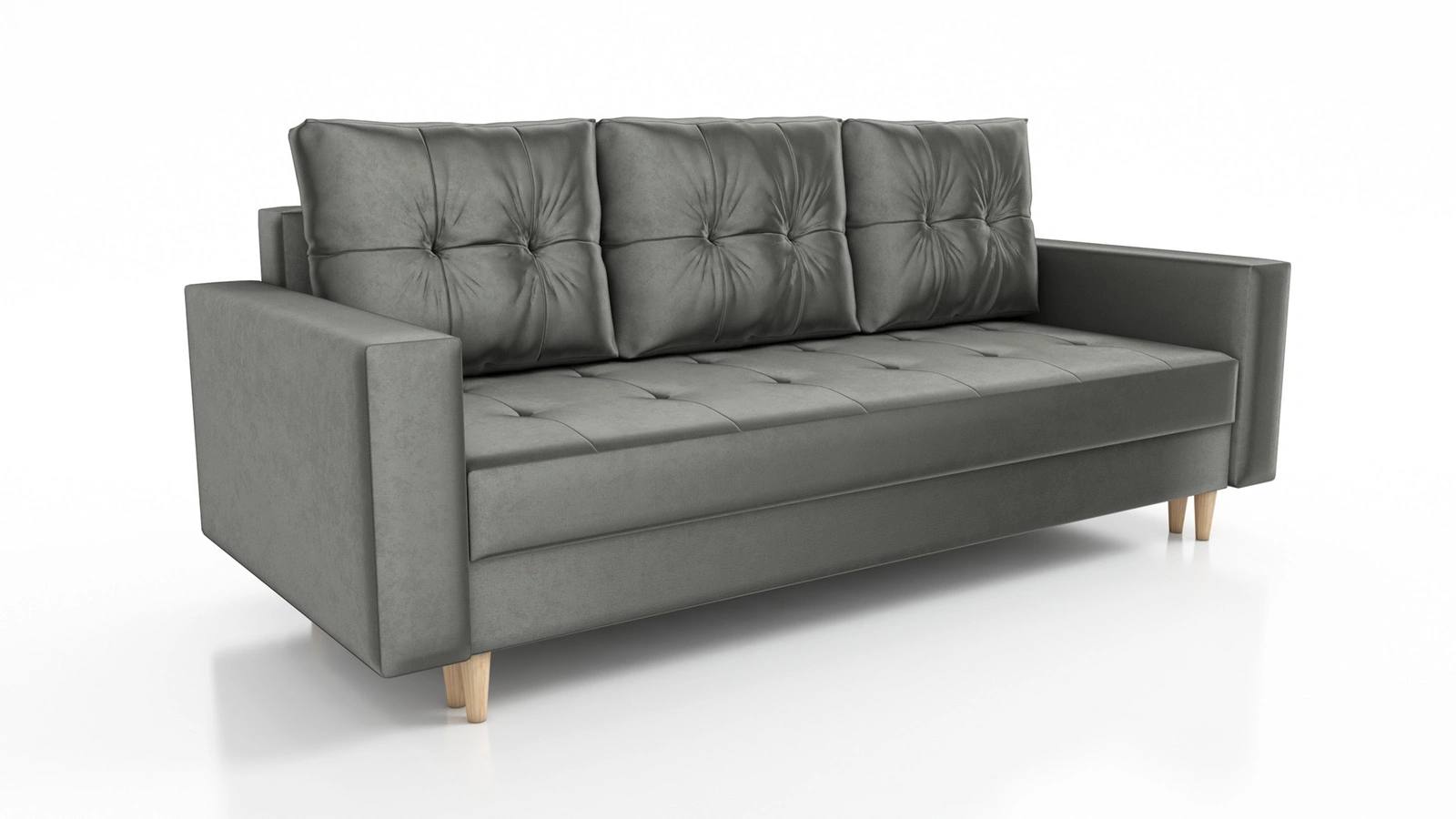 Kanapa rozkładana Vaso szara wygodna sofa do salonu w stylu skandynawskim drewniane wysokie nogi pojemnik na pościel