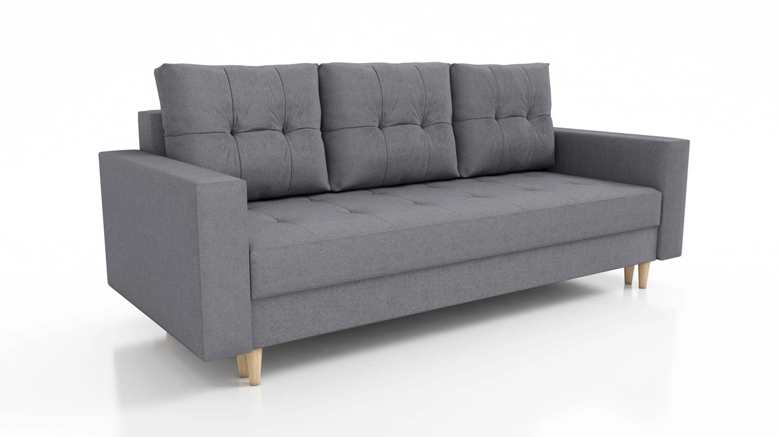 Kanapa rozkładana Vaso grafitowa wygodna sofa do salonu w stylu skandynawskim drewniane wysokie nogi pojemnik na pościel