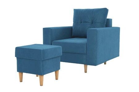 Fotel z podnóżkiem Vaso niebieski wygodny fotel do salonu w stylu skandynawskim miękkie siedzisko wysokie drewniane nogi