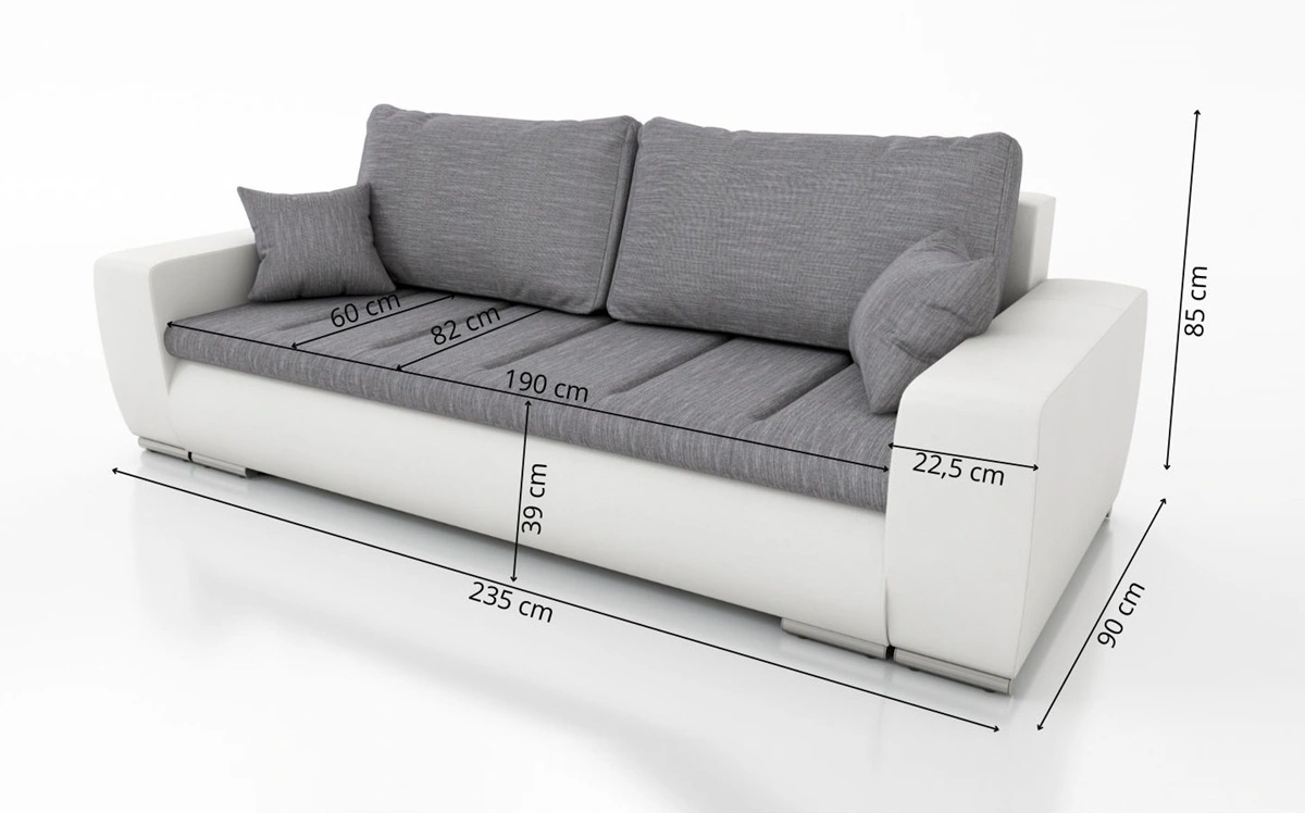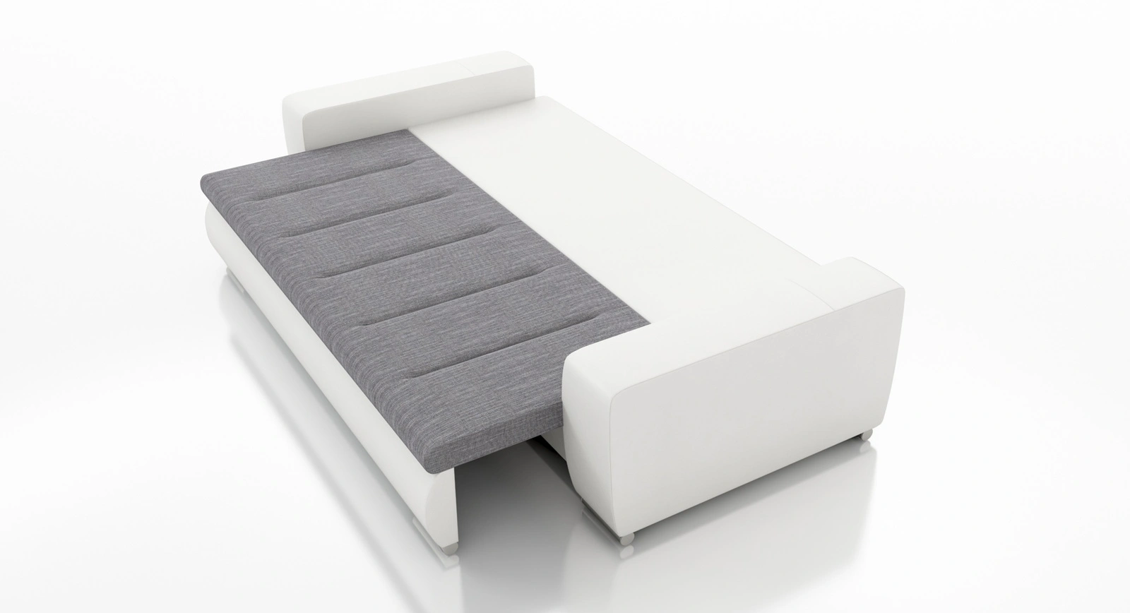 Kanapa Treso jest wyposażona w pojemnik na pościel, funkcja spania oraz oparcie z dużymi poduchami.