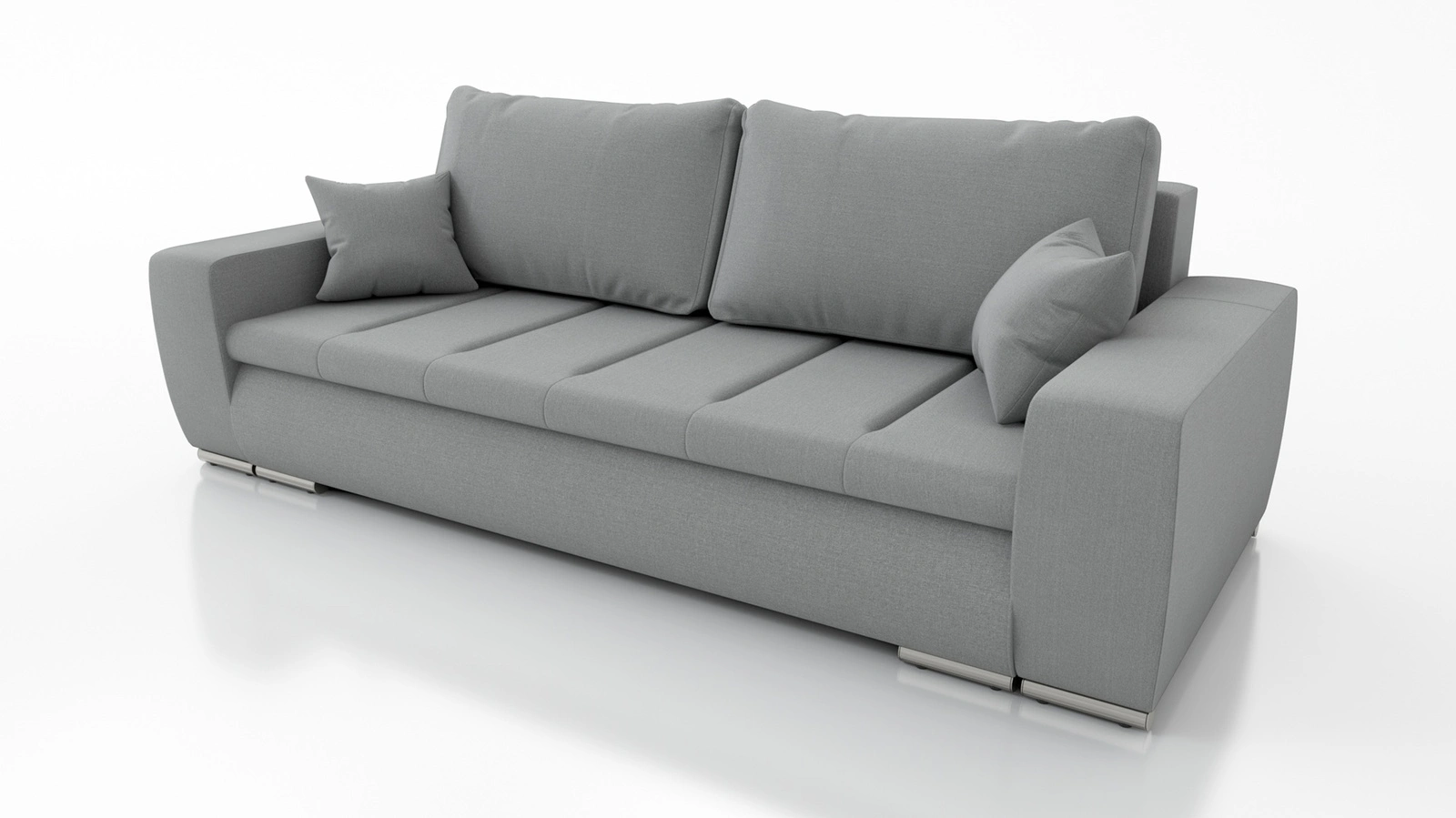 Kanapa Treso jest wyposażona w pojemnik na pościel, funkcja spania oraz oparcie z dużymi poduchami.
