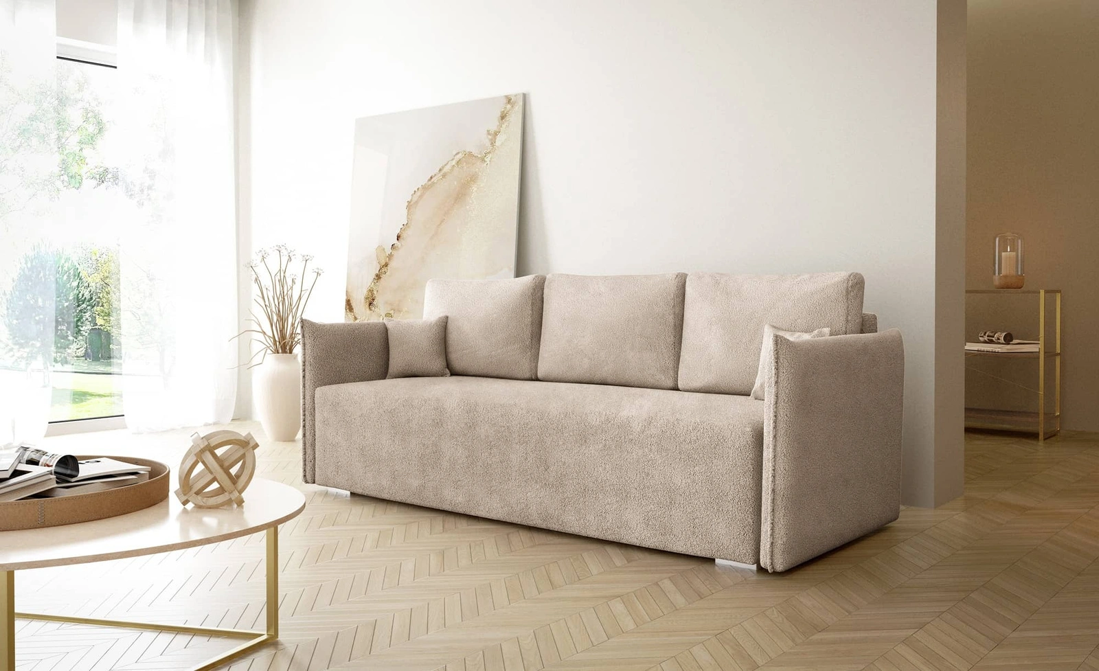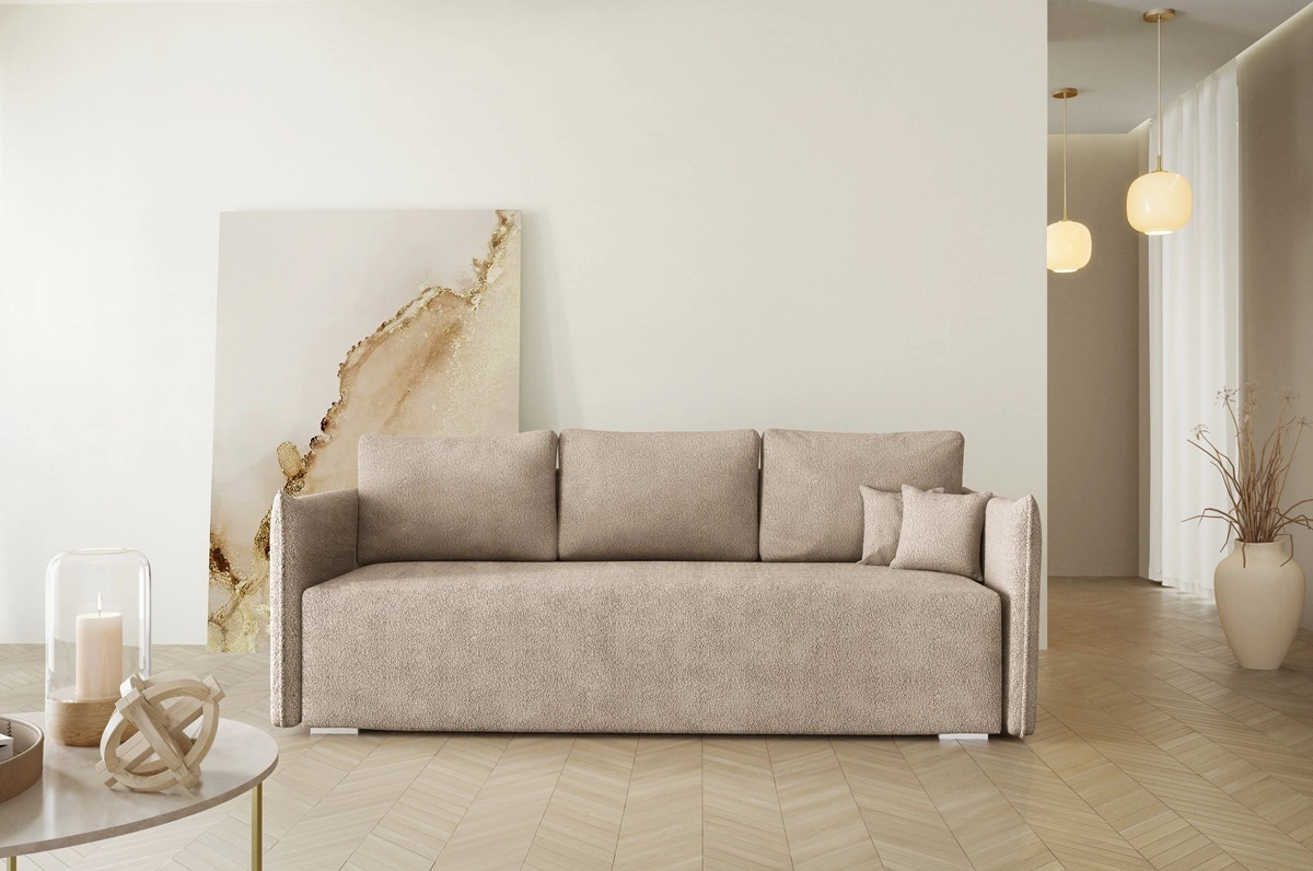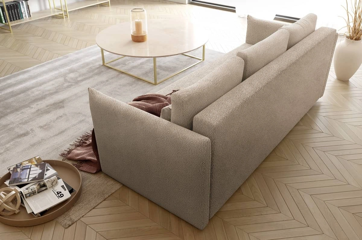 Kanapa rozkładana Bianco jasny beż funkcjonalna sofa do salonu o nowoczesnym minimalistycznym designie wykonana z tkaniny typu boucle