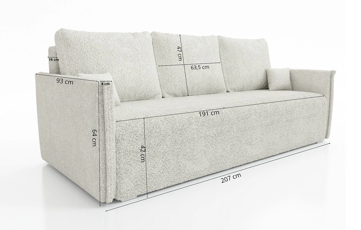 Kanapy z funkcja spania z kolekcji Bianco to meble o klasycznej konstrukcji w nowoczesnym designie, które idealnie wkomponują się w każdą aranżację. Kanapa w całości pokryta została tkaniną typu boucle Lambi 10. Sofa charakteryzuje się wysoką jakością wykonania, nowoczesnym, minimalistycznym wyglądem podkreślonym gładkim wykończeniem siedziska oraz boczków bryły. Gustowne poduchy oparciowe zapewnią jeszcze większy komfort i wygodę użytkowania tej niezwykle modernistycznej kanapy do salonu. Przez swoje niewielkie wymiary kanapa rozkładana sprawdzi się w mniejszych mieszkaniach gdzie oszczędność miejsca jest głównym priorytetem.