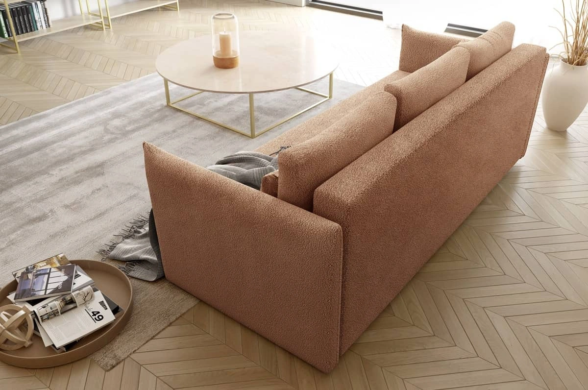 Kanapa rozkładana Bianco ciemny beż funkcjonalna sofa do salonu o nowoczesnym minimalistycznym designie wykonana z tkaniny typu boucle