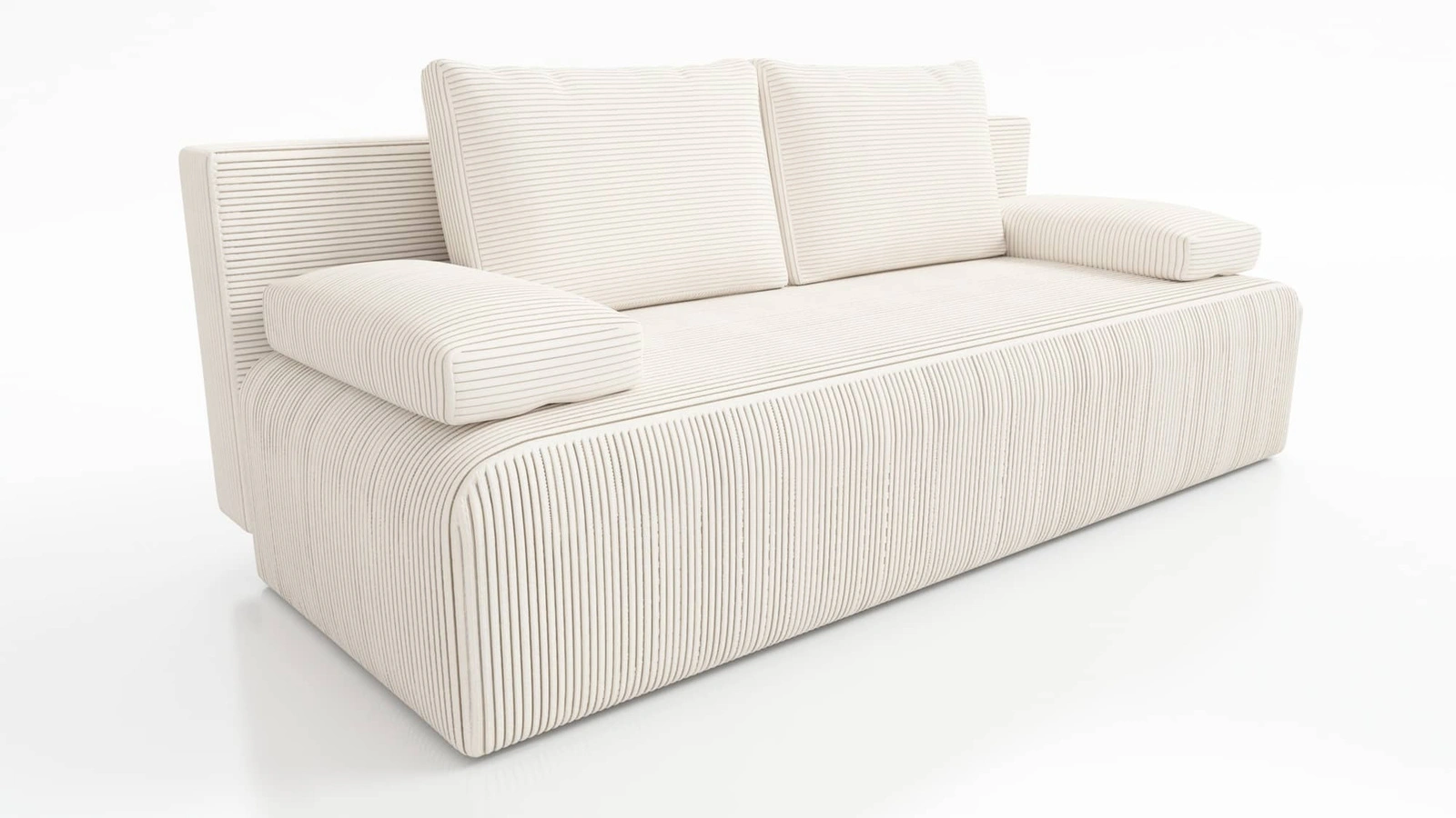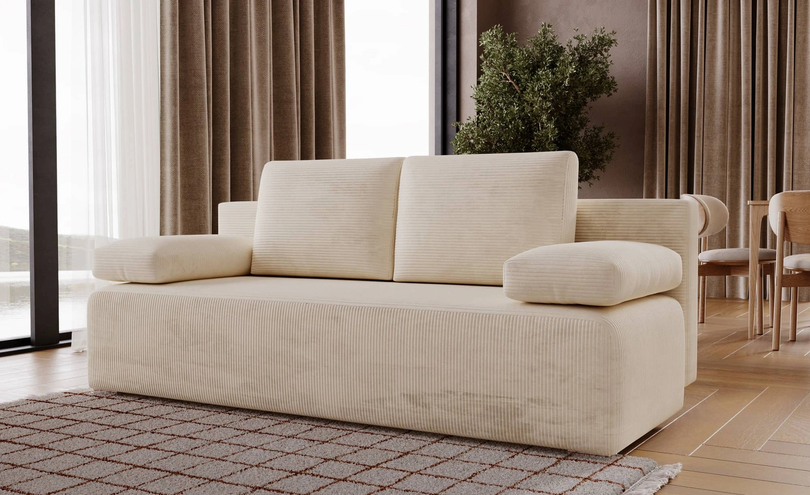 Kanapa rozkładana Zoe beżowa funkcjonalna sofa o prostym minimalistycznym designie pojemnik na pościel sztruksowa tkanina
