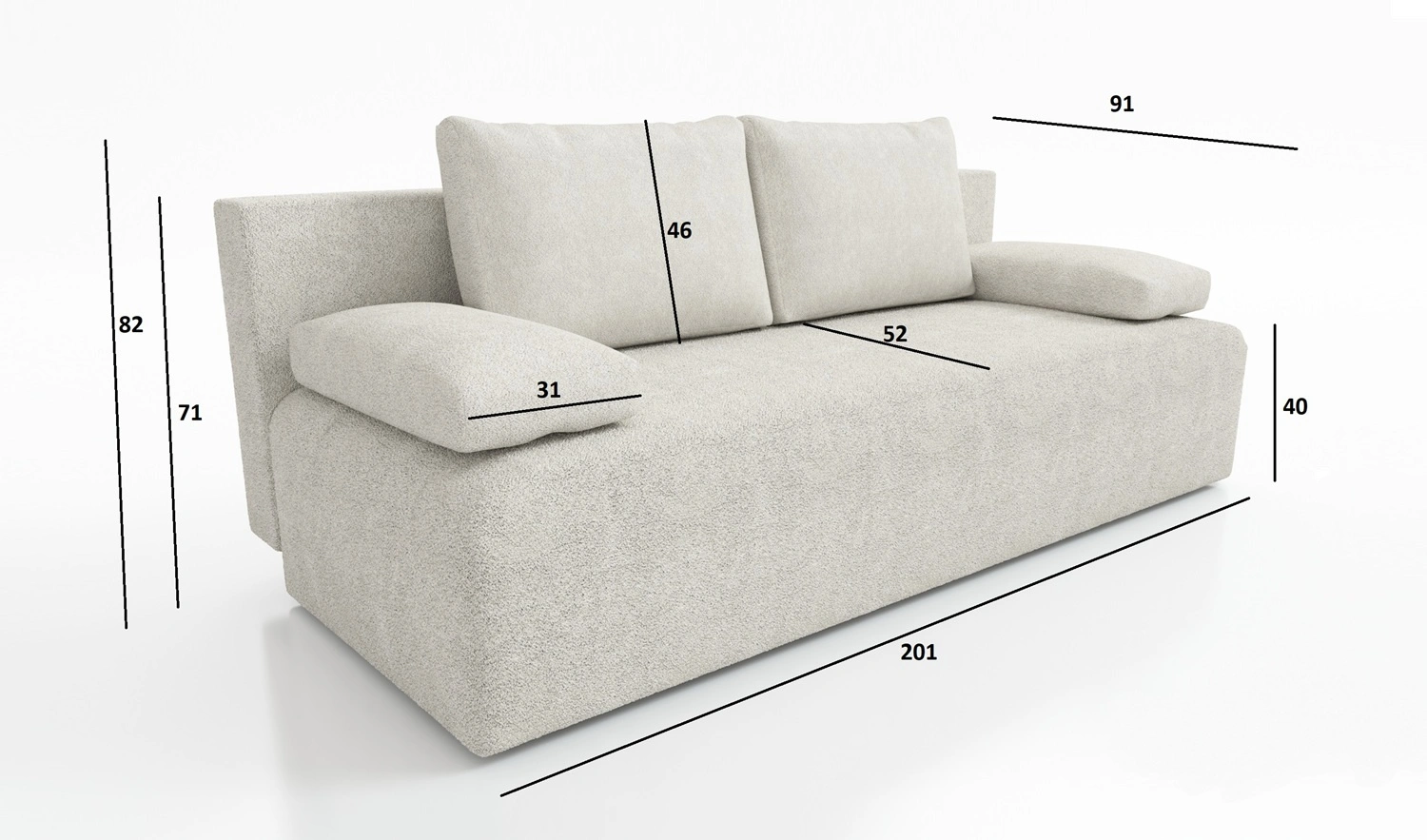 Kanapa z funkcją spania z kolekcji Zoe to prosty mebel o nowoczesnym designie, które idealnie wkomponują się w każdą aranżację. Kanapa w całości pokryta została tkaniną typu boucle Lambi 05. Sofa charakteryzuje się wysoką jakością wykonania oraz nowoczesnym wyglądem podkreślonym gładkim wykończeniem siedziska. Gustowne poduchy oparciowe zapewnią jeszcze większy komfort i wygodę użytkowania tej niezwykle modernistycznej kanapy do salonu. Przez swoje niewielkie wymiary kanapa rozkładana sprawdzi się w mniejszych mieszkaniach gdzie oszczędność miejsca jest głównym priorytetem.