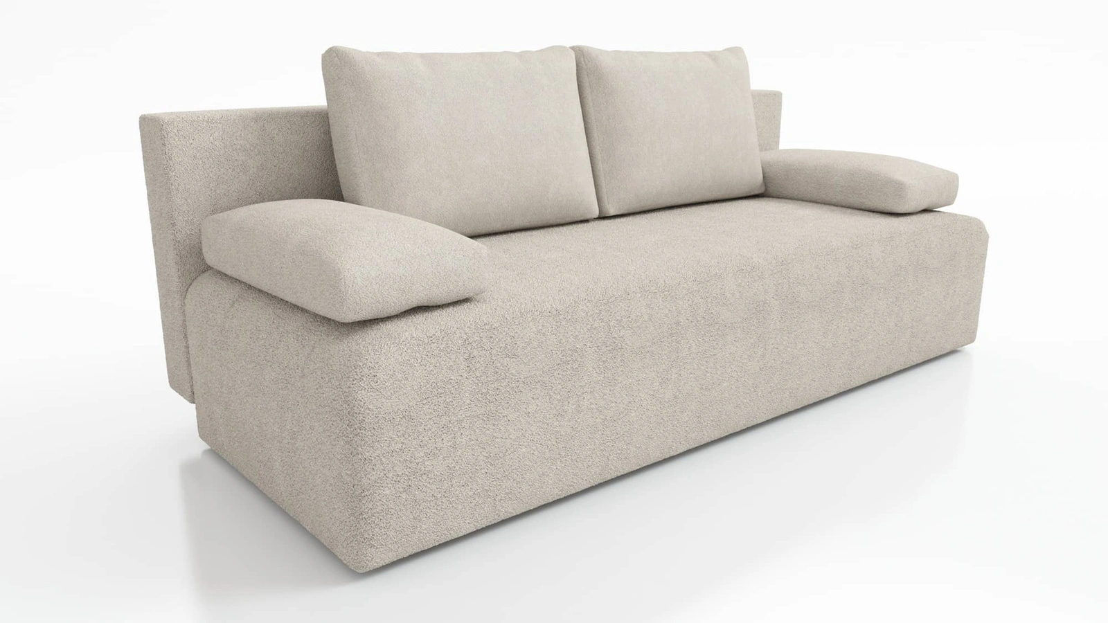 Kanapa rozkładana Zoe jasny beż funkcjonalna sofa o prostym minimalistycznym designie pojemnik na pościel tkanina typu boucle