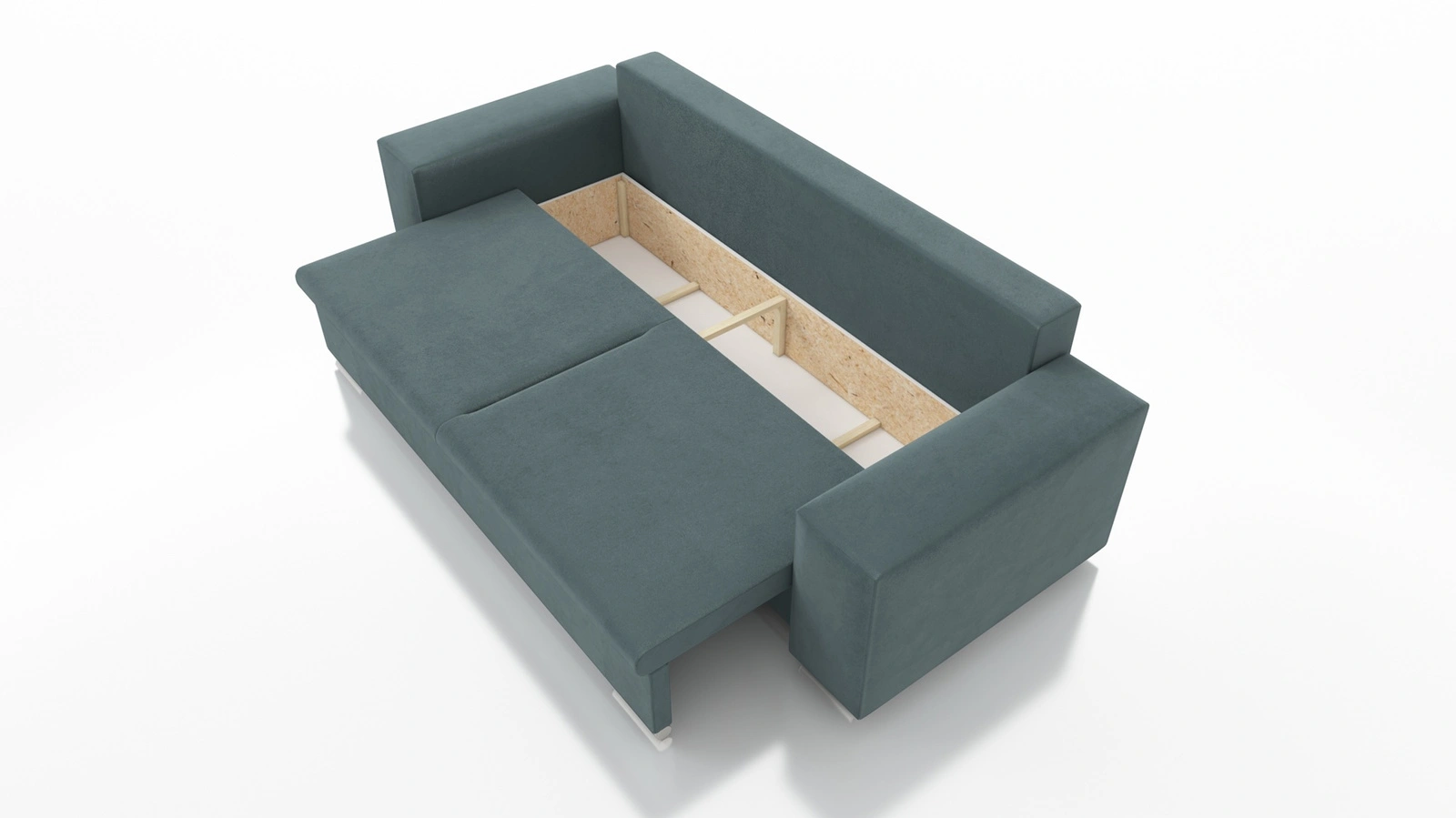 Sposób rozkładania narożnika to praktyczny i łatwy w obsłudze automat typu DL, który charakteryzuje się długą żywotnością. Rozłożenie pełnej powierzchni spania jest bardzo łatwe i nie wymaga użycia dużej siły. Powierzchnia spania kanapy wynosi 150x190 cm. Mebel wyposażony został w niskie metalowe nogi w kolorze chromu. Ta funkcjonalna kanapa wpasuje się do każdego typu pomieszczenia. Gwarantuje komfortowe i bezproblemowe korzystanie oraz trwałość całego mebla przez wiele lat użytkowania. Idealnie sprawdzi się w roli kanapy do salonu, kanapy z funkcją spania oraz każdym wnętrzu urządzonym w Twoim ulubionym stylu. Tapicerowany tył sofy umożliwia umieszczenie mebla w dowolnej części pomieszczenia.