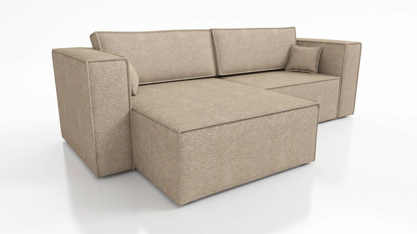 Narożnik z funkcją spania Otton to prosty mebel o nowoczesnym designie, który idealnie wkomponuje się w każdą aranżację. Narożnik Otton to mebel uniwersalny, co oznacza, że montaż szezlongu można dostosować do prawej lub lewej strony. Narożnik do salonu w całości pokryty został tkaniną typu boucle Lambi 05. Narożnik charakteryzuje się wysoką jakością wykonania, nowoczesnym wyglądem podkreślonym gładkim wykończeniem siedziska i boczków. Szerokie podłokietniki oraz gustowne poduchy oparciowe zapewnią jeszcze większy komfort i wygodę użytkowania tego niezwykle modernistycznego narożnika. Estetyczne wykończenie krawędzi mebla przy zastosowaniu szwu francuskiego nadaje niepowtarzalnego uroku.