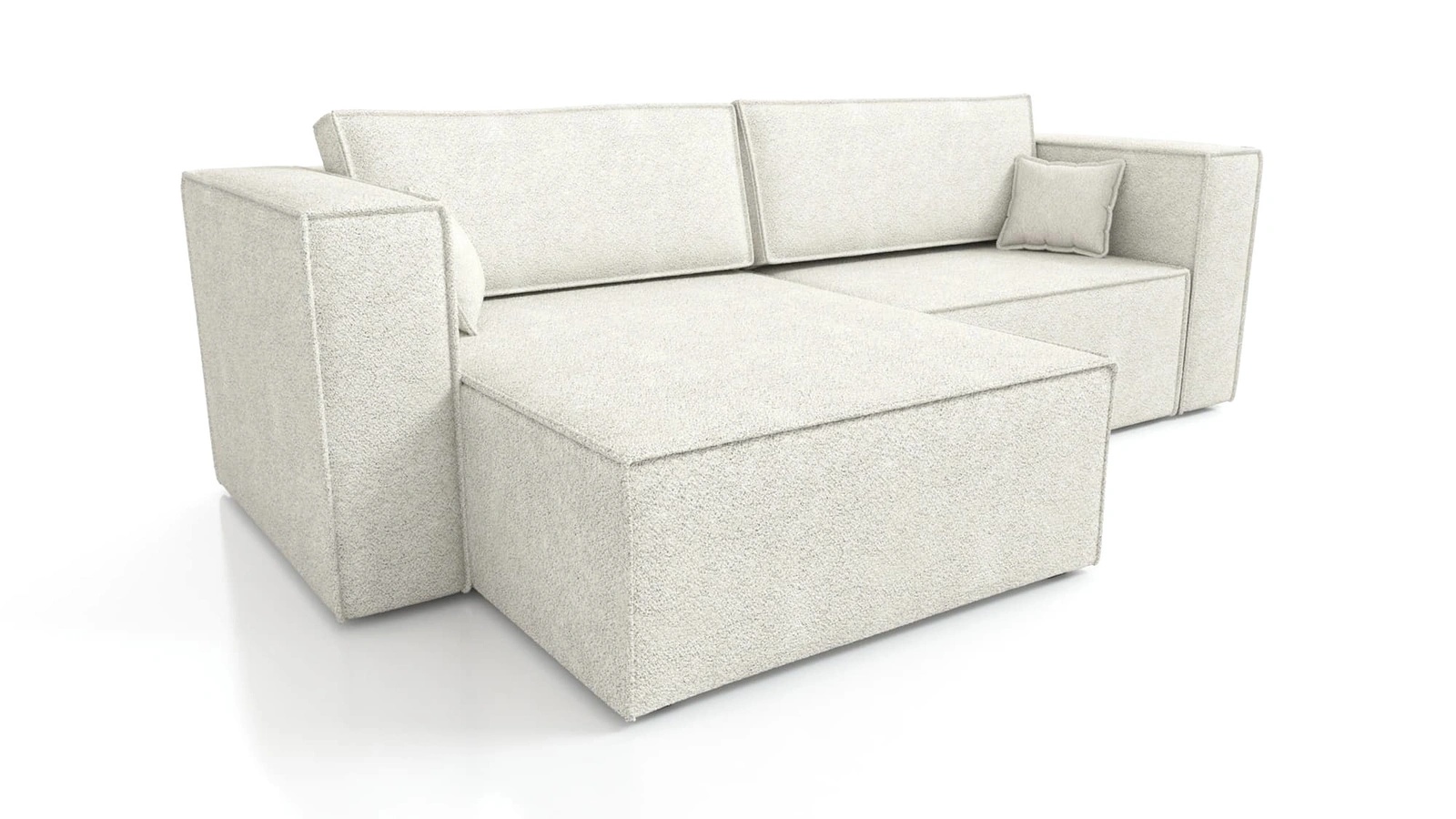 Narożnik z funkcją spania Otton to prosty mebel o nowoczesnym designie, który idealnie wkomponuje się w każdą aranżację. Narożnik Otton to mebel uniwersalny, co oznacza, że montaż szezlongu można dostosować do prawej lub lewej strony. Narożnik do salonu w całości pokryty został tkaniną typu boucle Lambi 07. Narożnik charakteryzuje się wysoką jakością wykonania, nowoczesnym wyglądem podkreślonym gładkim wykończeniem siedziska i boczków. Szerokie podłokietniki oraz gustowne poduchy oparciowe zapewnią jeszcze większy komfort i wygodę użytkowania tego niezwykle modernistycznego narożnika. Estetyczne wykończenie krawędzi mebla przy zastosowaniu szwu francuskiego nadaje niepowtarzalnego uroku.