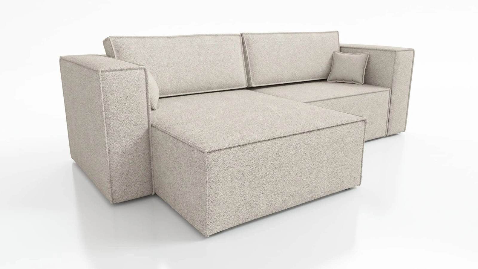 Narożnik z funkcją spania Otton to prosty mebel o nowoczesnym designie, który idealnie wkomponuje się w każdą aranżację. Narożnik Otton to mebel uniwersalny, co oznacza, że montaż szezlongu można dostosować do prawej lub lewej strony. Narożnik do salonu w całości pokryty został tkaniną typu boucle Lambi 08. Narożnik charakteryzuje się wysoką jakością wykonania, nowoczesnym wyglądem podkreślonym gładkim wykończeniem siedziska i boczków. Szerokie podłokietniki oraz gustowne poduchy oparciowe zapewnią jeszcze większy komfort i wygodę użytkowania tego niezwykle modernistycznego narożnika. Estetyczne wykończenie krawędzi mebla przy zastosowaniu szwu francuskiego nadaje niepowtarzalnego uroku.