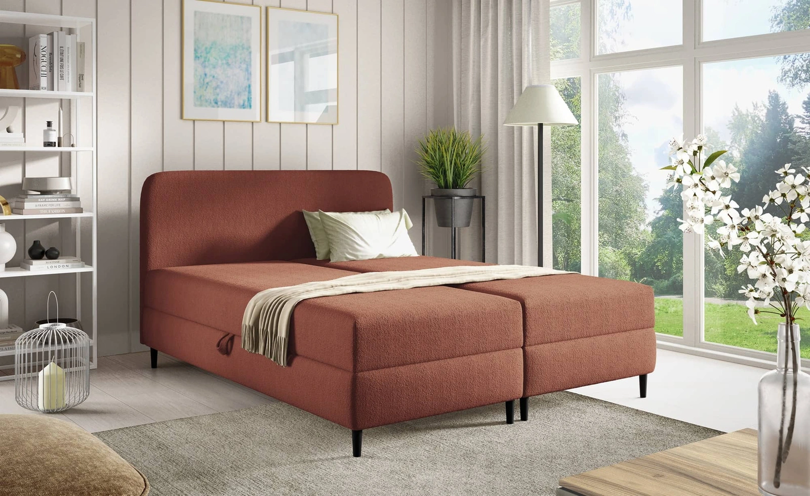 Łóżko kontynentalne Aberg 180x200 w kolorze ceglastym to idealny wybór do każdej sypialni lub pokoju młodzieżowego.
