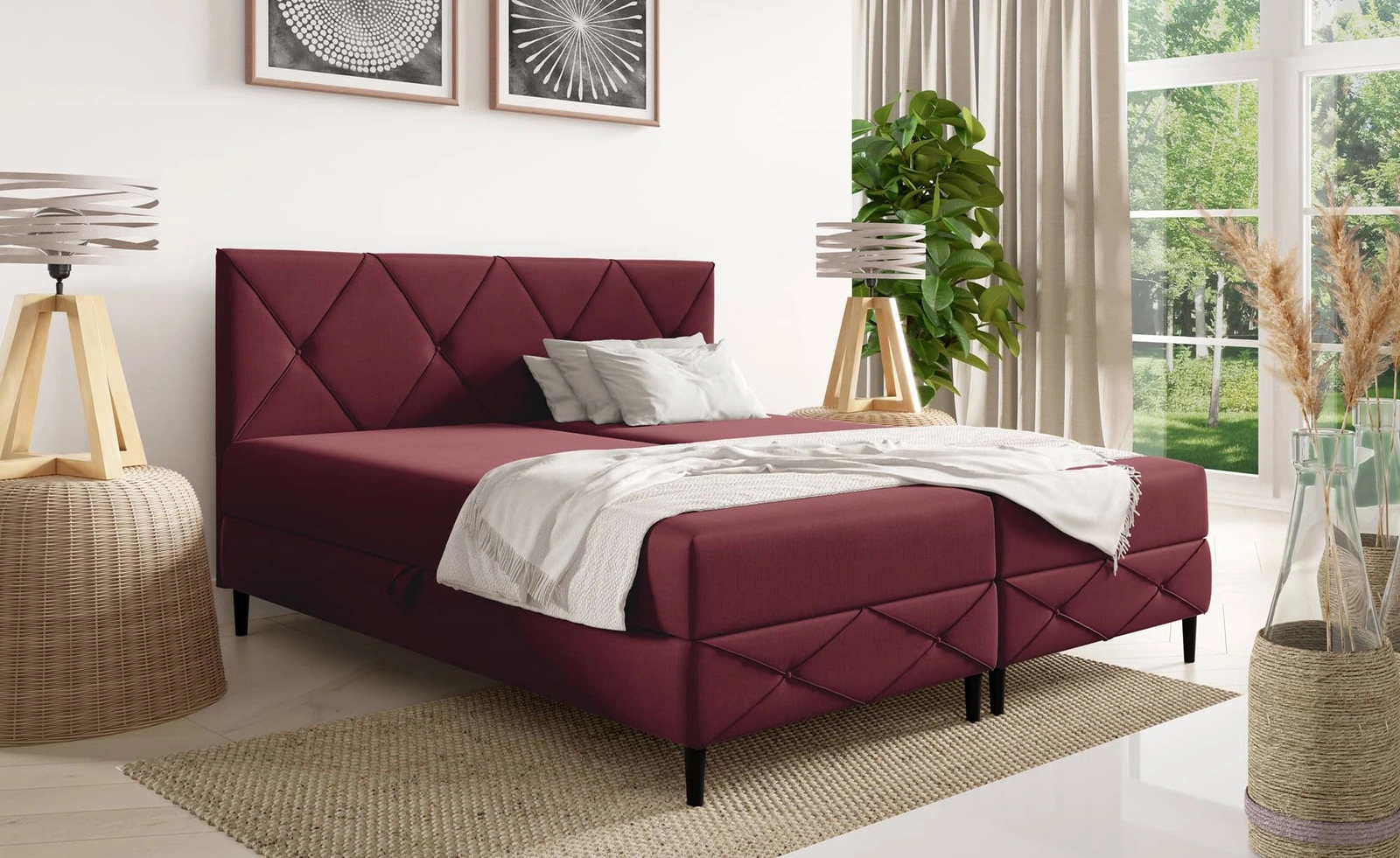 Łóżko kontynentalne Noren 140x200 bordowe nowoczesna forma łóżka z klasycznym pikowaniem na wezgłowiu duże pojemniki na pościel