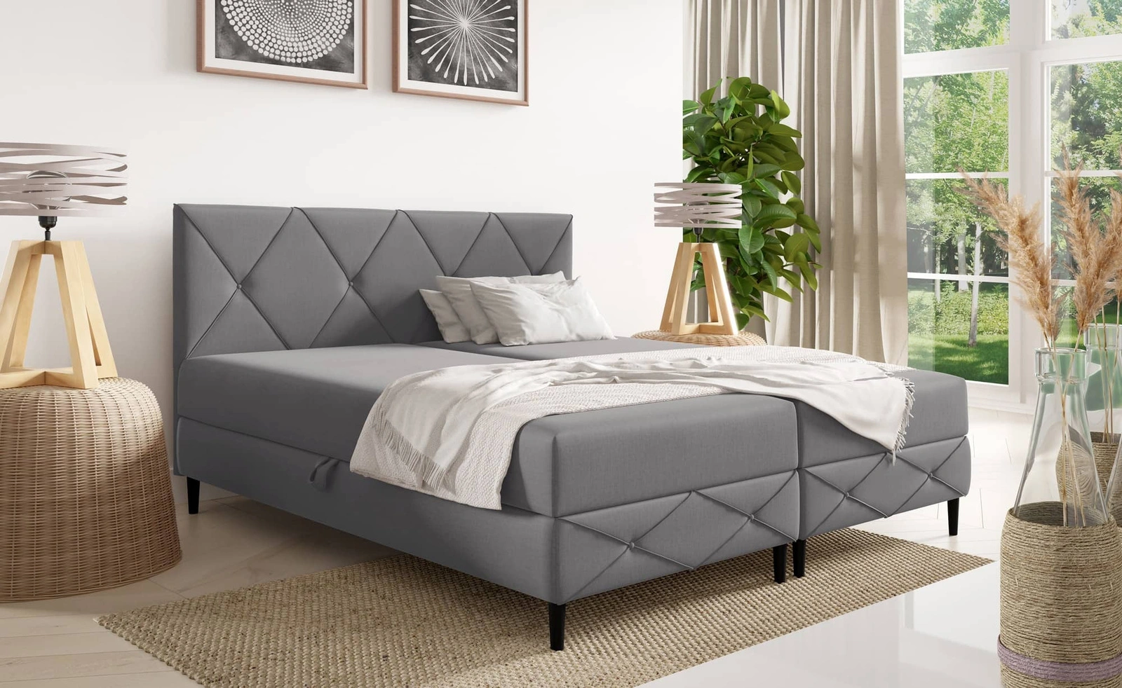 • Łóżko kontynentalne Noren ma nowoczesny, elegancki charakter, przez co świetnie wpasuje się do wnętrz w stylu minimalistycznym lub skandynawskim. Geometryczny wzór rombów na wezgłowiu dodaje stylu oraz luksusowego wyglądu.