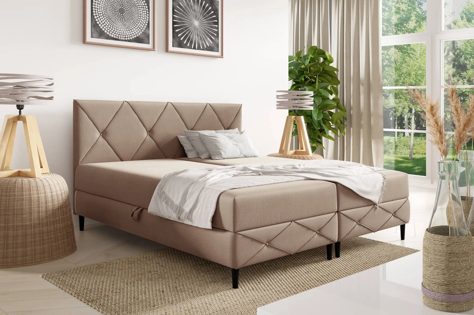 Łóżko kontynentalne Noren 180x200 beżowe nowoczesna forma łóżka do sypialni pojemniki na pościel klasyczne pikowanie na wezgłowiu