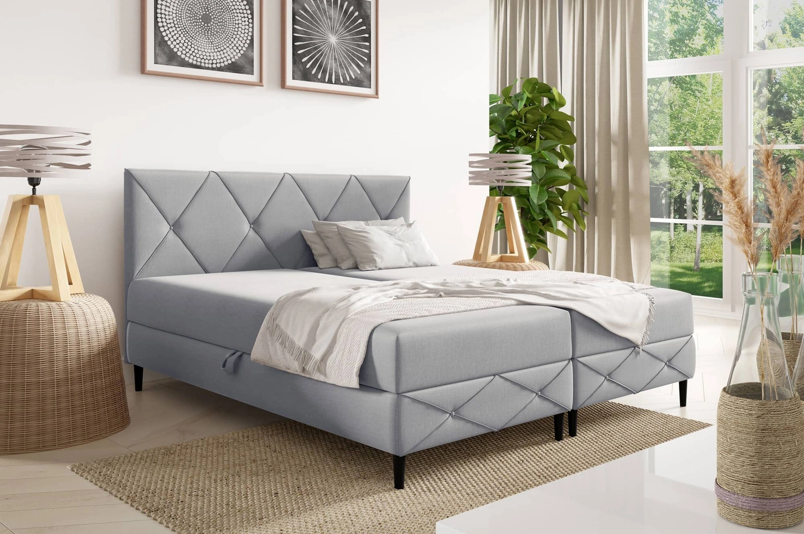 - Łóżko kontynentalne Noren ma nowoczesny, elegancki charakter, przez co świetnie wpasuje się do wnętrz w stylu minimalistycznym lub skandynawskim. Geometryczny wzór rombów na wezgłowiu dodaje stylu oraz luksusowego wyglądu.