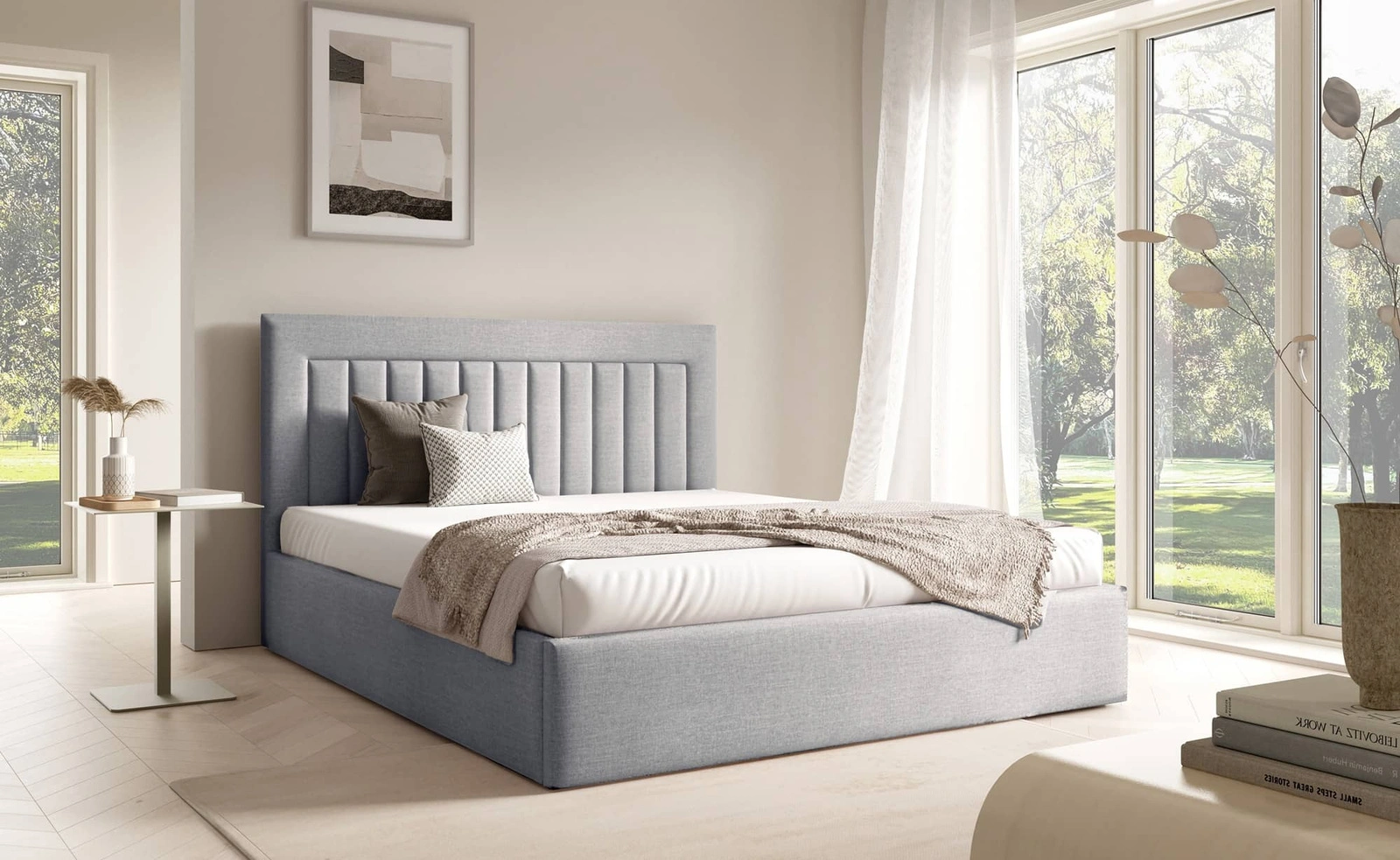 Łóżko tapicerowane Togo 140x200 szary popiel eleganckie i funkcjonalne łóżko do sypialni gustowne pionowe przeszycia na wezgłowiu