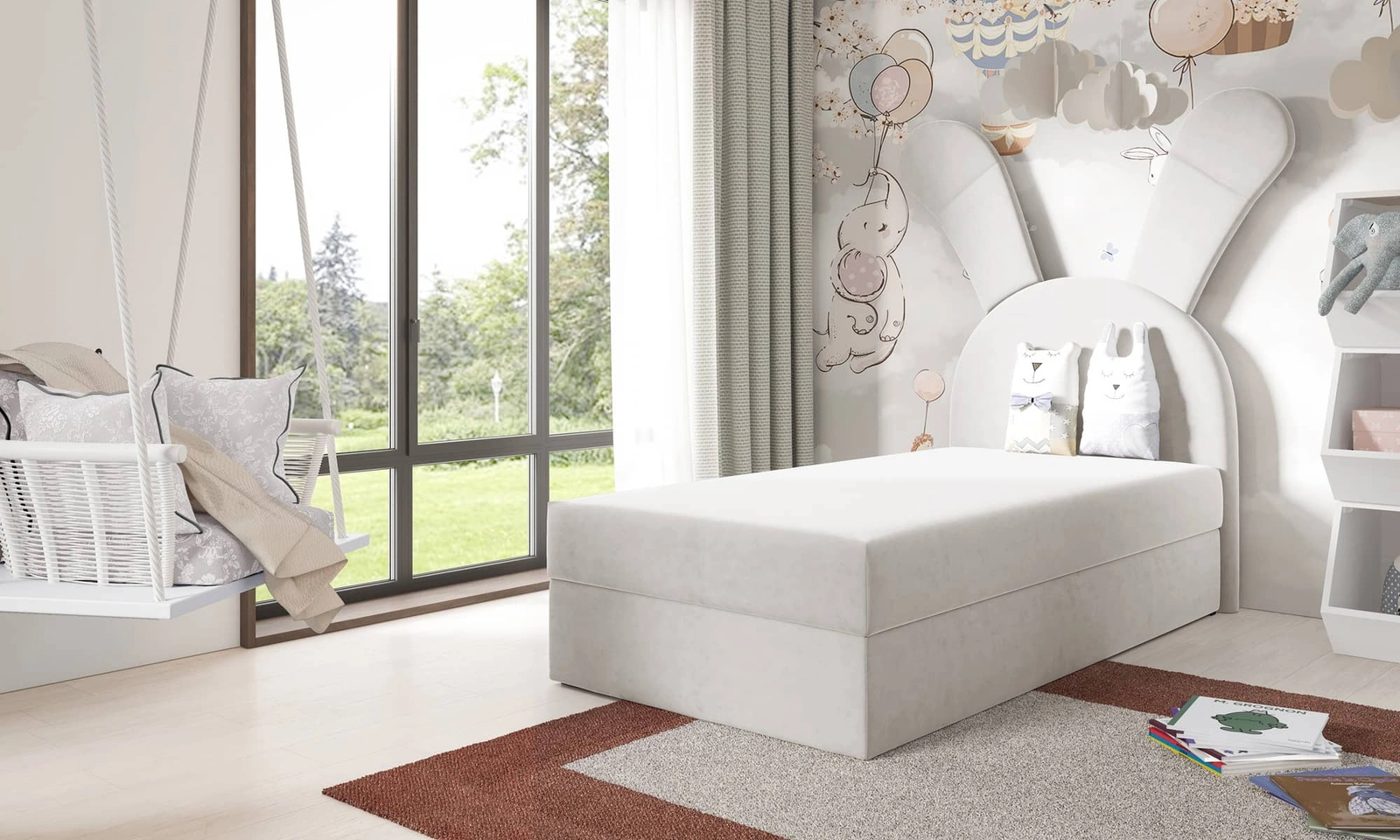 Łóżko kontynentalne Beti to doskonałe rozwiązanie do pokoju dziecięcego, które łączy nowoczesny design z funkcjonalnością, idealnie dopasowując się do potrzeb najmłodszych użytkowników. Bajeczny design sprawia, że łóżko tapicerowane doskonale dopasuje się do każdej aranżacji pokoju dziecięcego, dodając ciepła i lekkości. Elementem przyciągającym wzrok jest unikatowy zagłówek w kształcie króliczka, który stanowi urocze wykończenie mebla. Dzięki urokliwej konstrukcji, łóżko z pewnością przypadnie do gustu każdemu dziecku oraz stanie się ważnym akcentem aranżacji wnętrza.