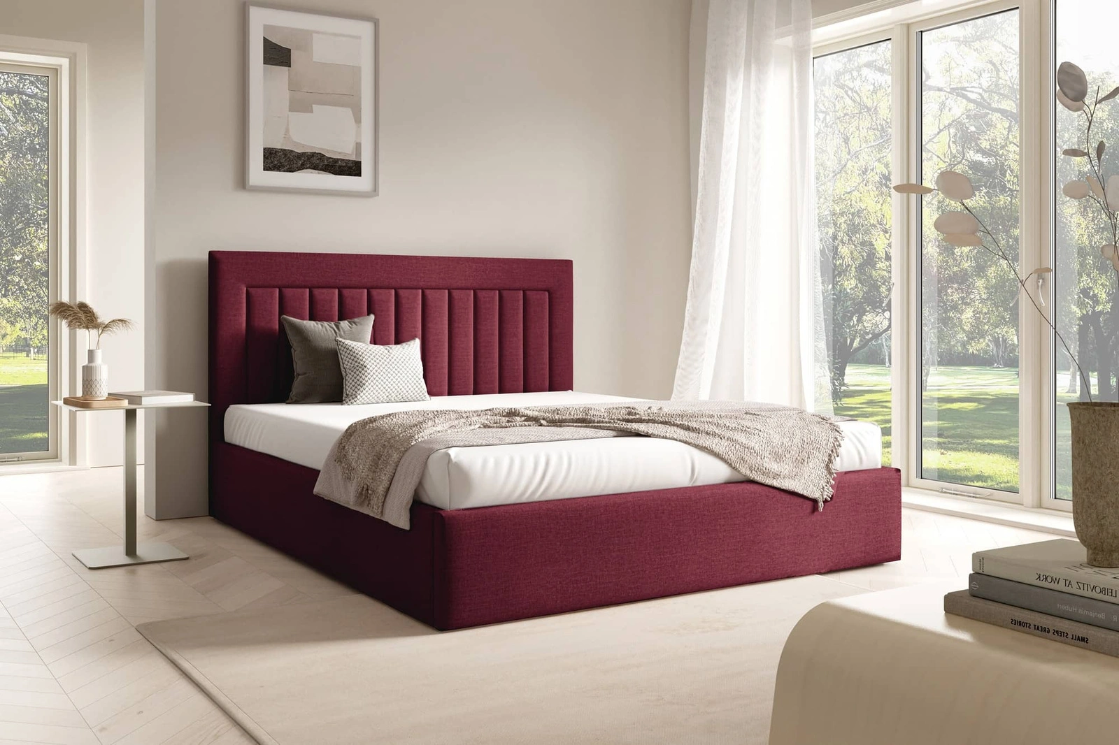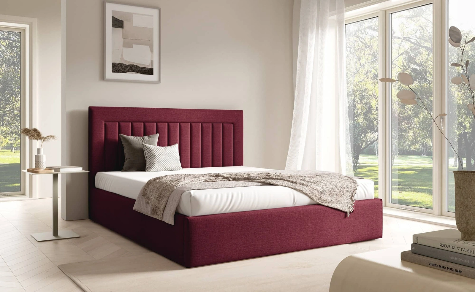 Łóżko tapicerowane Togo 180x200 bordowe eleganckie i funkcjonalne łóżko do sypialni gustowne pionowe przeszycia na wezgłowiu