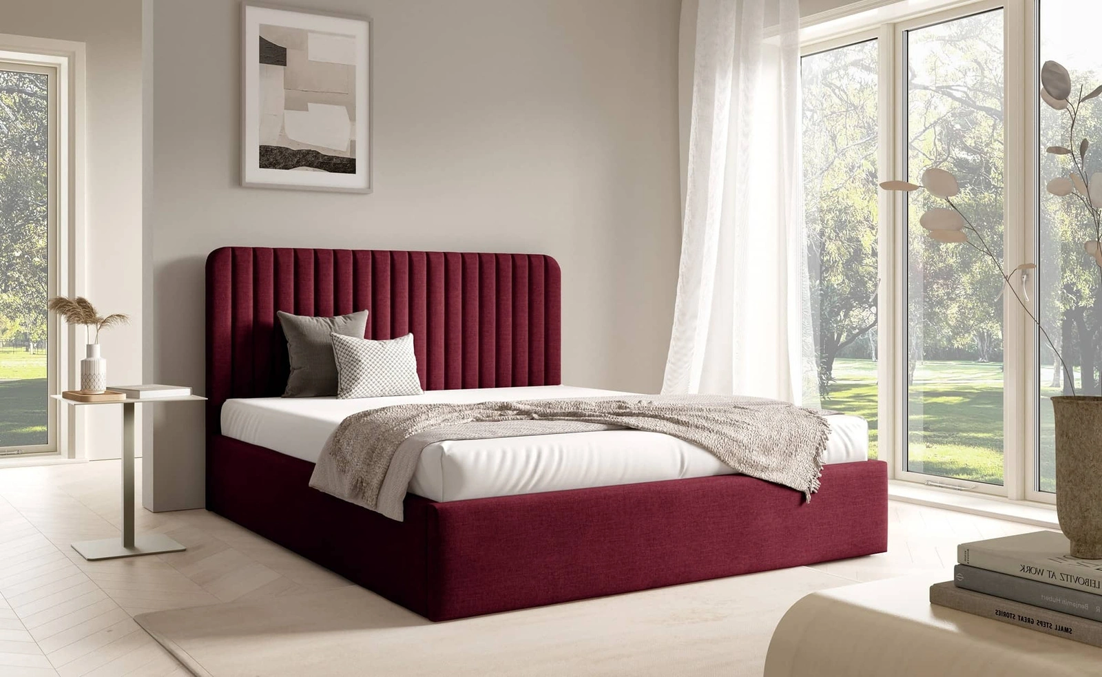 Łóżko tapicerowane Faro 160x200 w kolorze bordowym zostało zaprojektowane z myślą o wygodzie i estetyce.