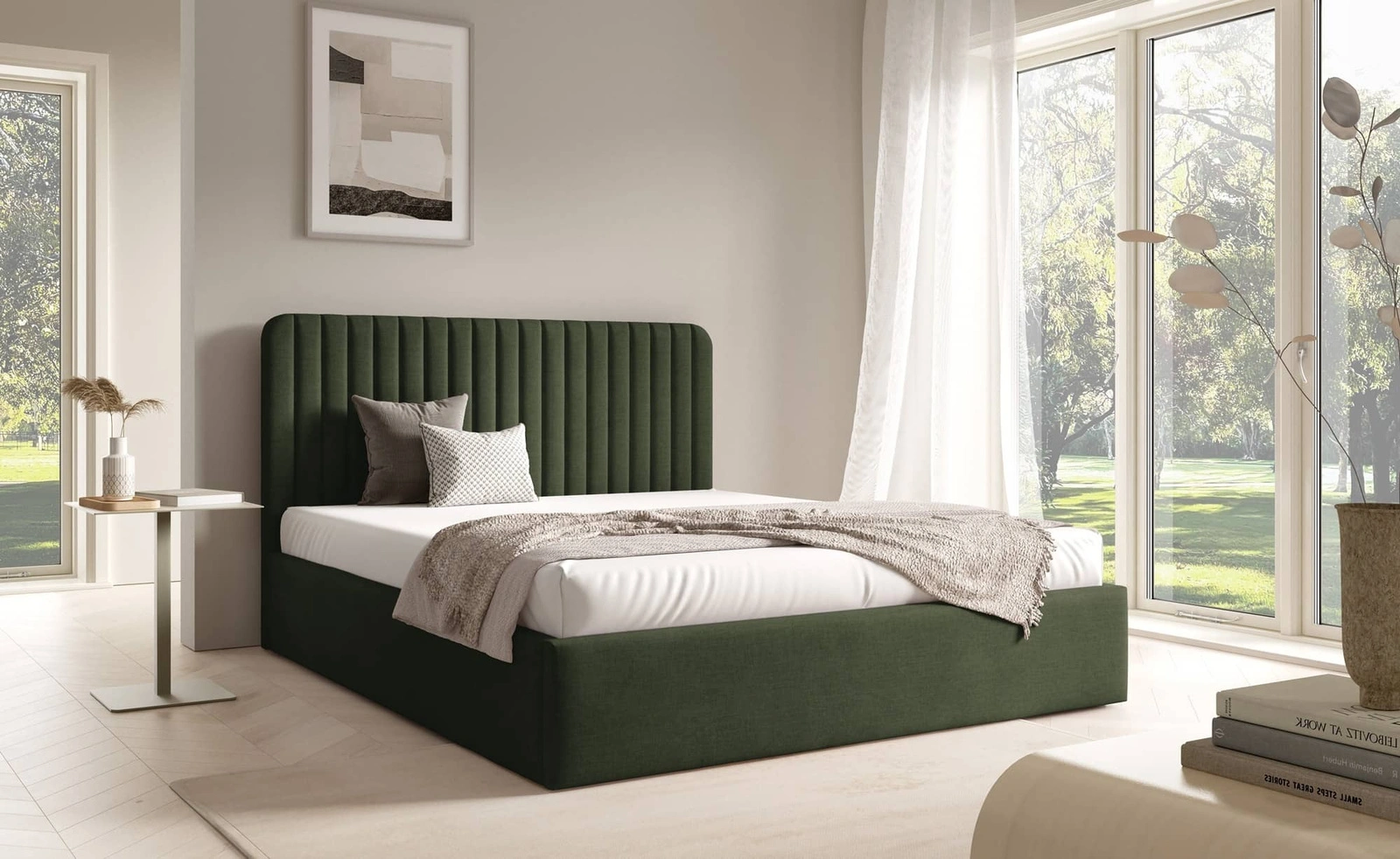 Łóżko tapicerowane Faro 160x200 zielone wygodne łóżko do sypialni designerskie wezgłowie o subtelnie zaokrąglonym kształcie