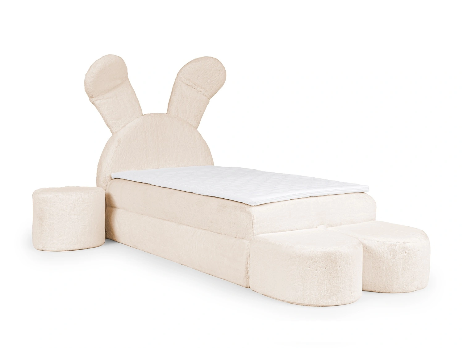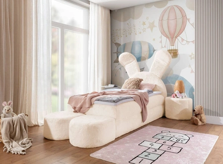 Łóżko kontynentalne Beti Plus 100x200 beżowe uroczy design unikatowy zagłówek w kształcie króliczka łózko z szafkami nocnymi i pufami