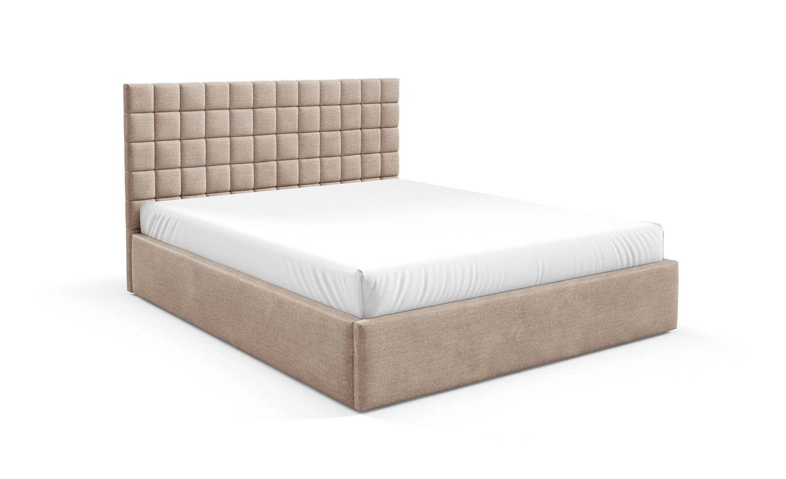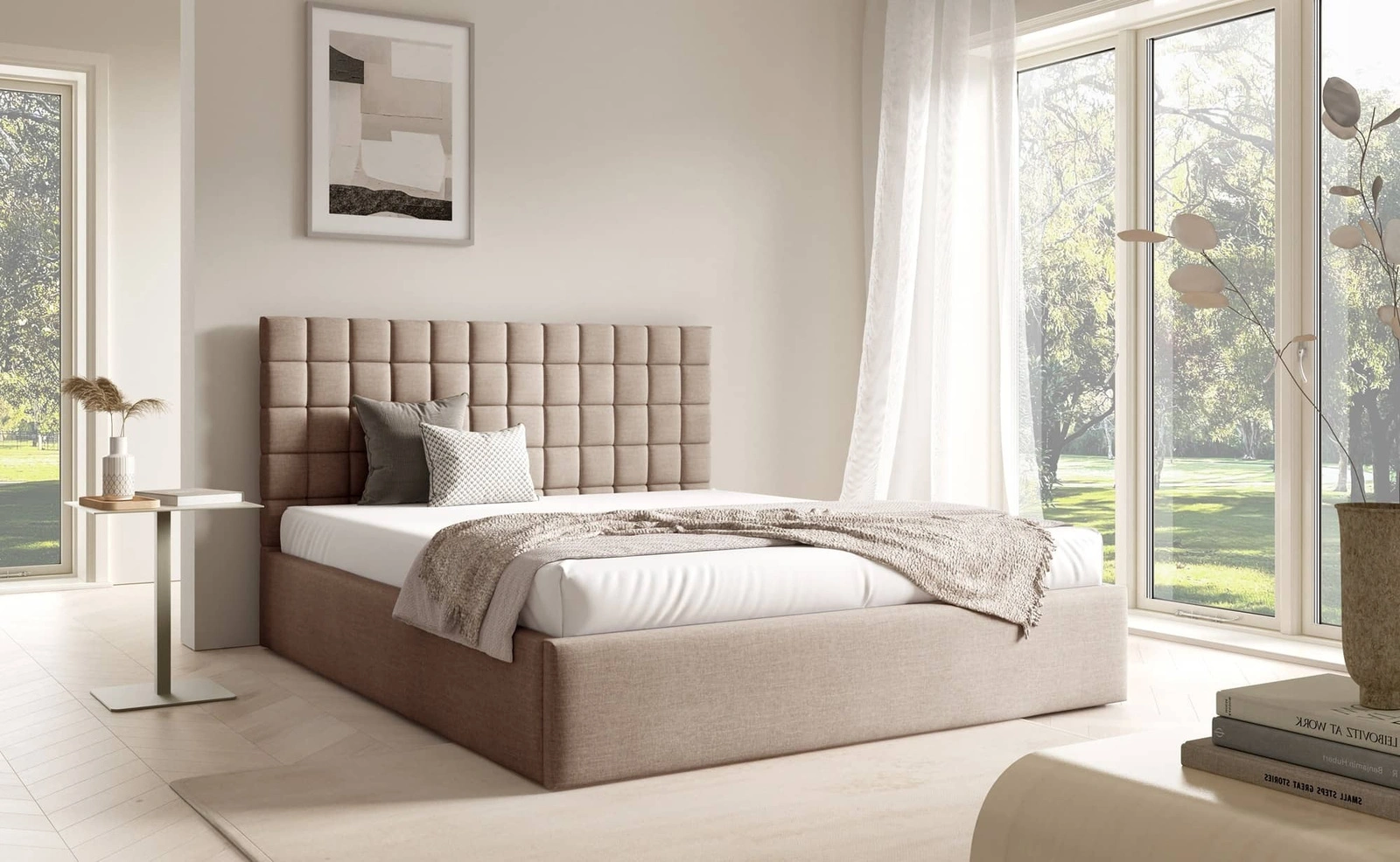 - Łóżko tapicerowane Graso to bryła charakteryzująca się nowoczesną elegancją. Wysokie, designerskie wezgłowie z głębokimi przeszyciami tworzącymi symetryczny wzór kwadratów nadaje trójwymiarowości i stylu, dodatkowo stanowi solidne oparcie dla pleców.