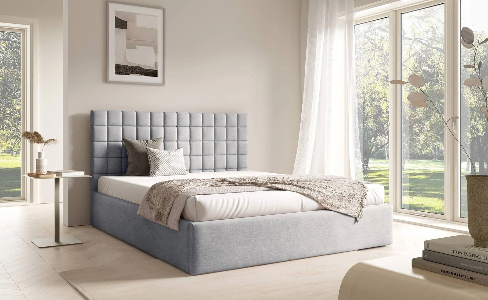 Łóżko tapicerowane Graso to stylowe i nowoczesne łóżko do sypialni, którego design opiera się prostych liniach i starannie dopracowanych detalach. Estetyka łóżka łączy w sobie elegancję i funkcjonalność, idealnie wpisując się do pomieszczeń w stylu skandynawskim, klasycznym oraz minimalistycznym. Wysokie wezgłowie z pikowaniem to najbardziej charakterystyczny element łóżka, który definiuje styl całej bryły, dodatkowo stanowi solidne podparcie dla pleców. Regularne, głębokie przeszycia, tworzące wzór symetrycznych kwadratów nadają trójwymiarowości, a także podkreślają luksusowy charakter łóżka do sypialni 160x200. Nowoczesne wzornictwo łóżka tapicerowanego spełni najbardziej wygórowane oczekiwania pod względem funkcjonalności jak i designu.