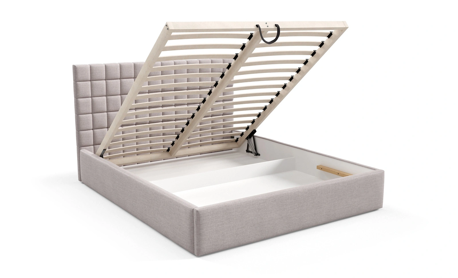 Standardowym wyposażeniem łóżka jest drewniany stelaż z listwami elastycznymi. Zagęszczenie listew gwarantuje odpowiednie podparcie materaca i jego właściwe użytkowanie. Dla większej funkcjonalności łóżko tapicerowane jest wyposażone w duży pojemnik, który umożliwi wygodne przechowywanie pościeli oraz niezbędnych akcesoriów. Dostęp do pojemnika łóżka jest możliwy po podniesieniu materaca. Niezawodne automaty na sprężynach wspomagające podnoszenie ułatwią tę czynność.