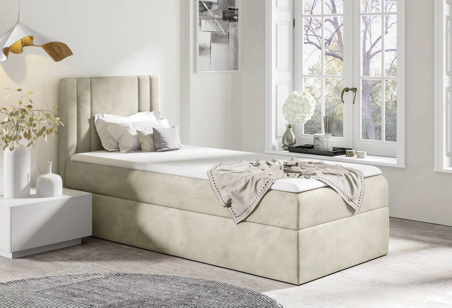 Łóżko kontynentalne Alia 80x200 w kolorze beżowym to idealny wybór do każdej sypialni lub pokoju dziecięcego.