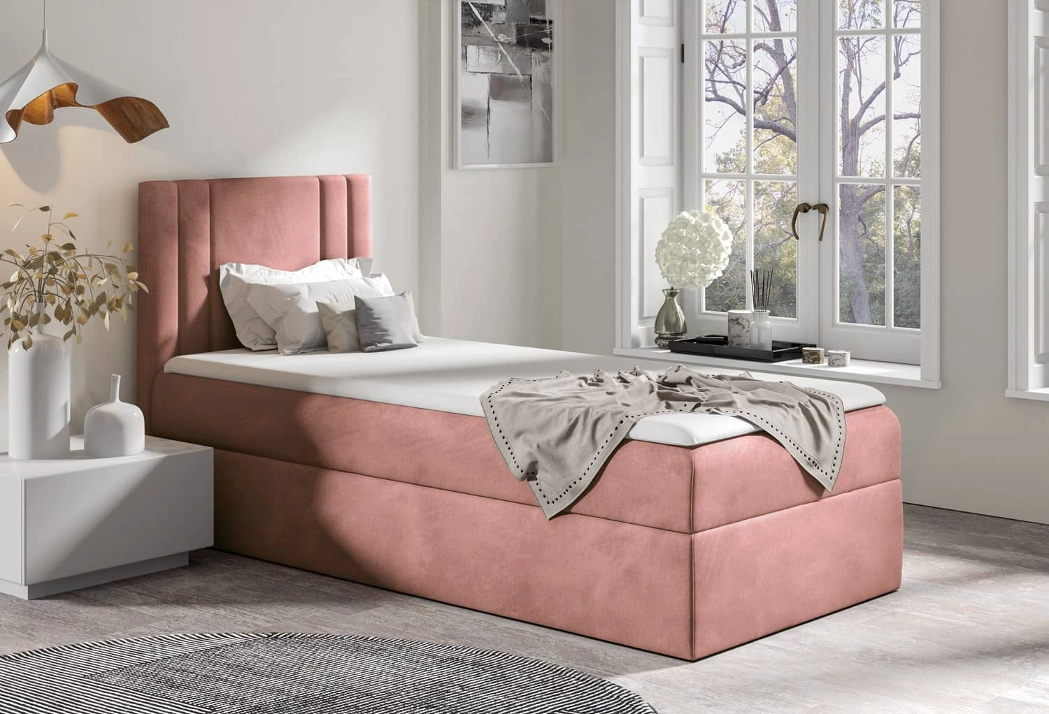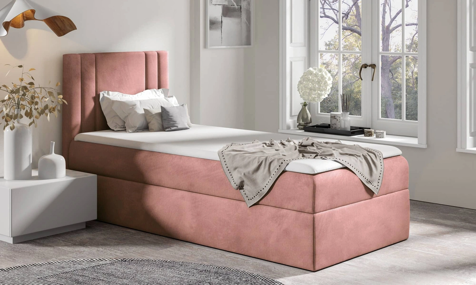 Łóżko kontynentalne Alia 80x200 w kolorze kwarcowy róż to idealny wybór do każdej sypialni lub pokoju dziecięcego.
