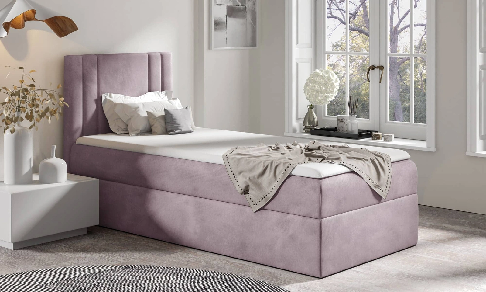 Łóżko kontynentalne Alia 80x200 w kolorze wrzosowym to idealny wybór do każdej sypialni lub pokoju dziecięcego.