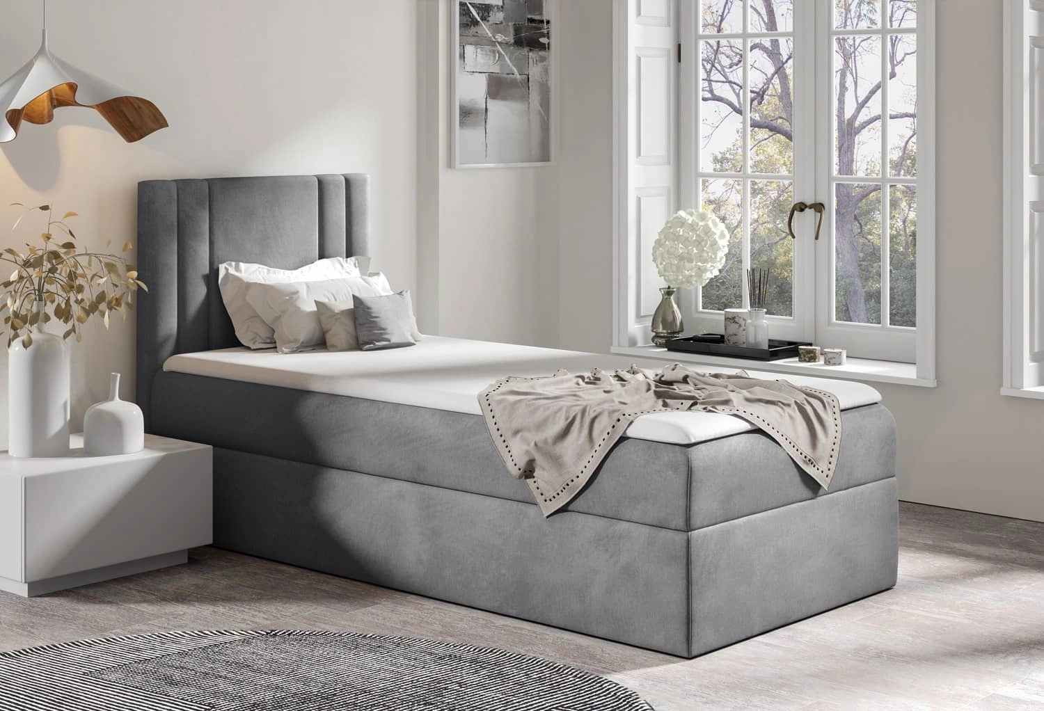 Łóżko kontynentalne Alia 80x200 w kolorze jasny szary to idealny wybór do każdej sypialni lub pokoju dziecięcego.