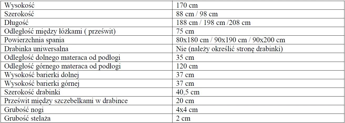 Wymiary łóżka piętrowego Piotrek: