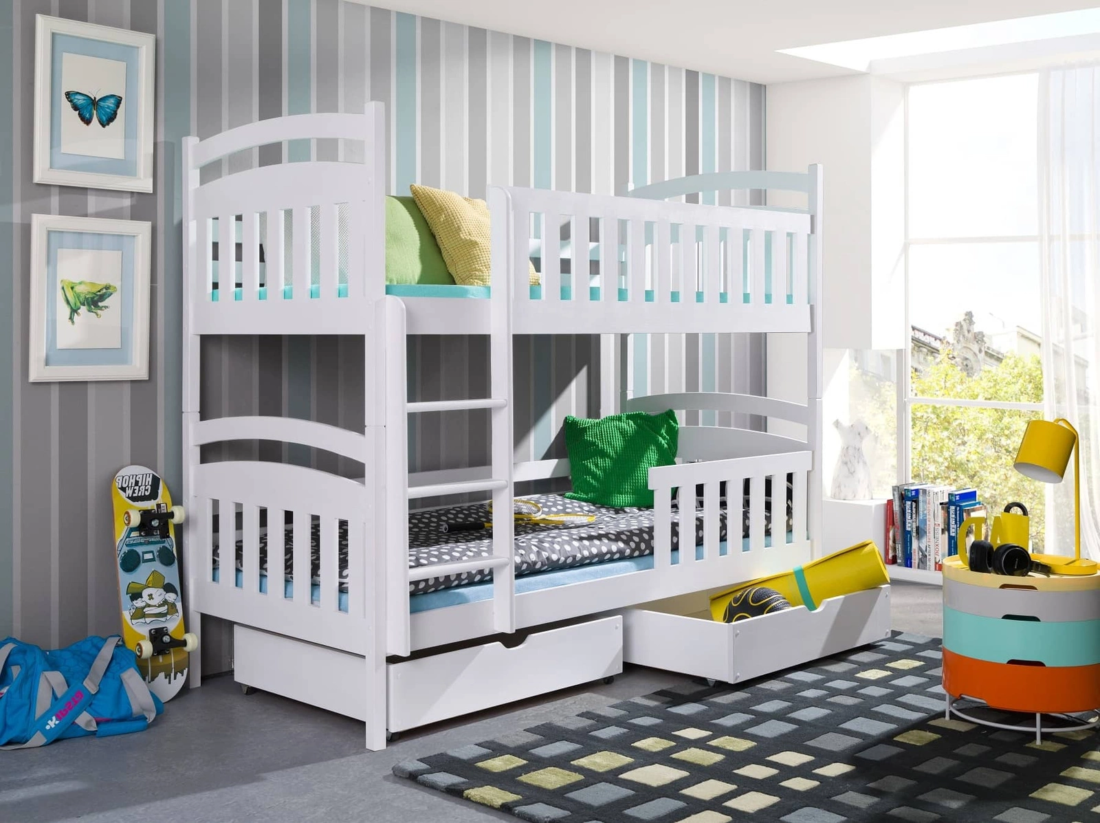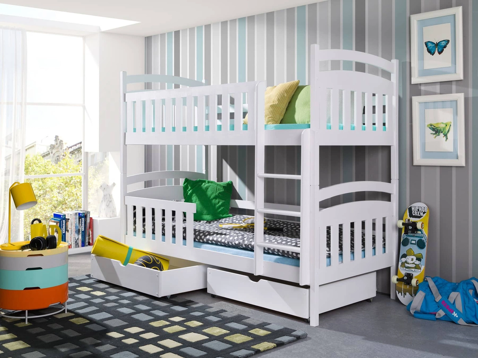 Atutem łóżka piętrowego są dwie szuflady wysuwane na kółkach, które mogą służyć jako pojemnik na pościel lub zabawki dzieci.