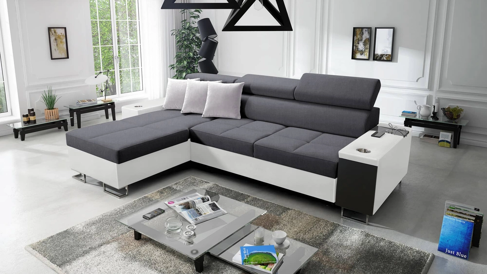 Narożnik Dafni w kolorze grafit / biały z regulowanymi zagłówkami to przepis na nowoczesne wnętrze w Twoim domu!
