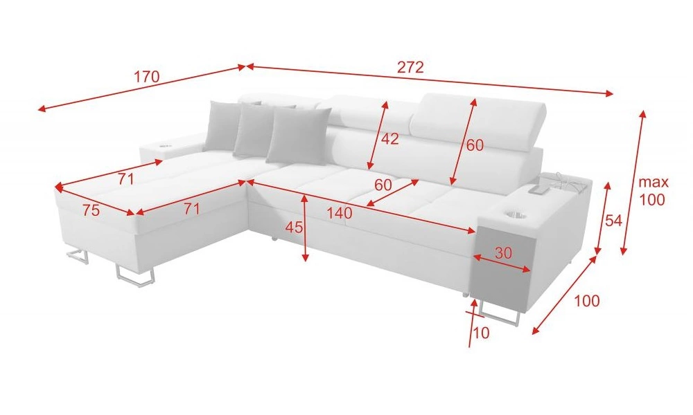 Wymiary mebla są optymalne. Szerokość narożnika 272 cm, wysokość maksymalna 100 cm oraz głębokość 170 cm. Powierzchnia spania narożnika wynosi 127x215 cm. Wysokość siedziska mebla to 45 cm a maksymalna wysokość oparcia wynosi 60 cm. Sprężyny faliste oraz pianka poliuretanowa T30 to materiał, z którego wykonane zostało siedzisko narożnika. Oparcie stałe z regulowanymi zagłówkami daje gwarancję wygodnego wypoczynku po długim dniu, które docenisz Ty, Twoi bliscy a także goście, którzy zasiądą na tym wyjątkowym narożniku!
