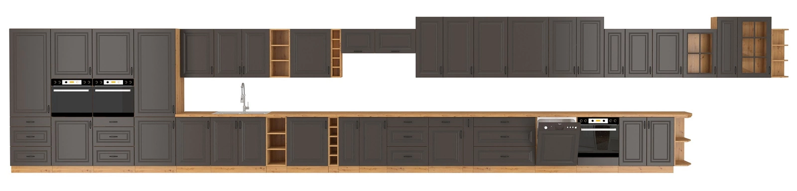 Fronty szafki kuchennej pod zlewozmywak w kolorze szary grafit zostały wykonane z płyty MDF oraz wykończone stylowym frezem. Obrzeża frontów szafki kuchennej zabezpiecza okleina ABS, która spełnia dwie funkcje. Jest zabezpieczeniem przeciw wilgoci oraz chroni przed przypadkowym uszkodzeniem.