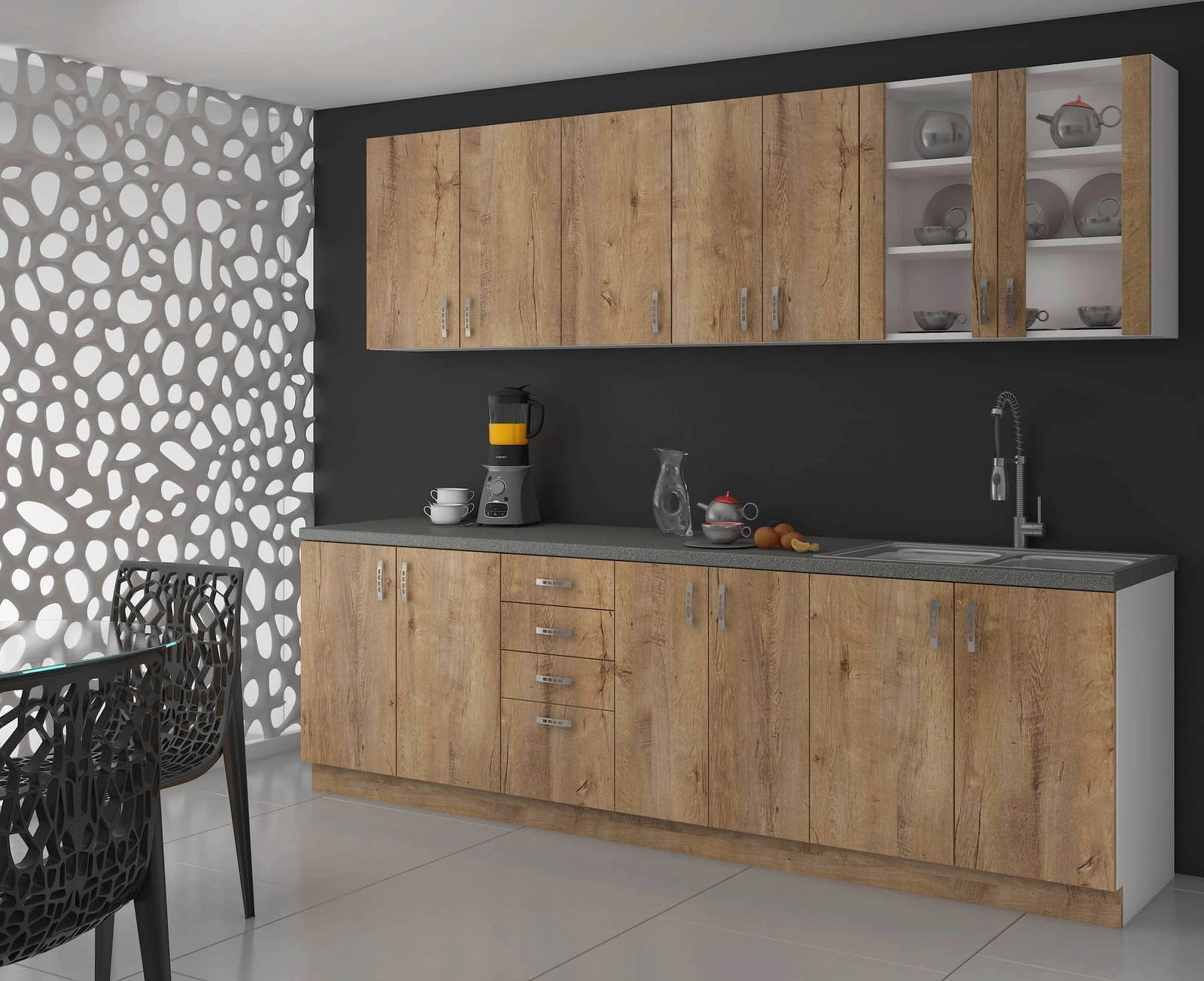 Fronty oraz korpus szafki kuchennej są wykonane z wysokiej jakości płyty laminowanej o grubości 16 mm. Zaletą tego rodzaju płyty jest wysoka odporność na wpływ zewnętrznych czynników takich jak para wodna, wysoka temperatura, rozlane ciecze. Obrzeża zabezpieczone okleiną ABS zwiększają wytrzymałość szafki kuchennej. Połączenie ponadczasowych kolorów bieli z dębem lefkas, nadaje meblom elegancji i niepowtarzalnego stylu.